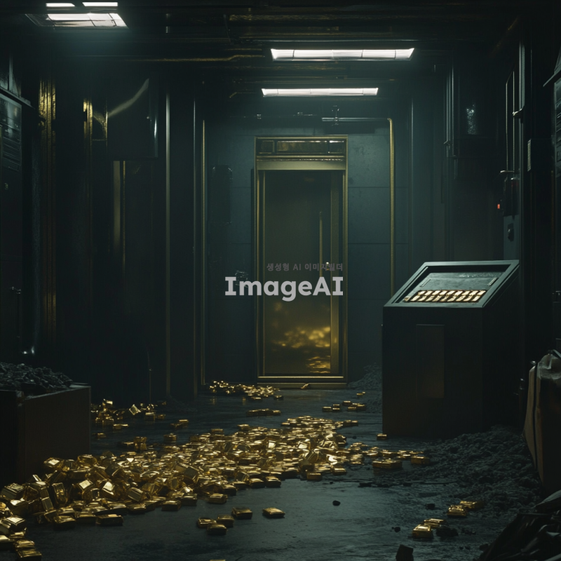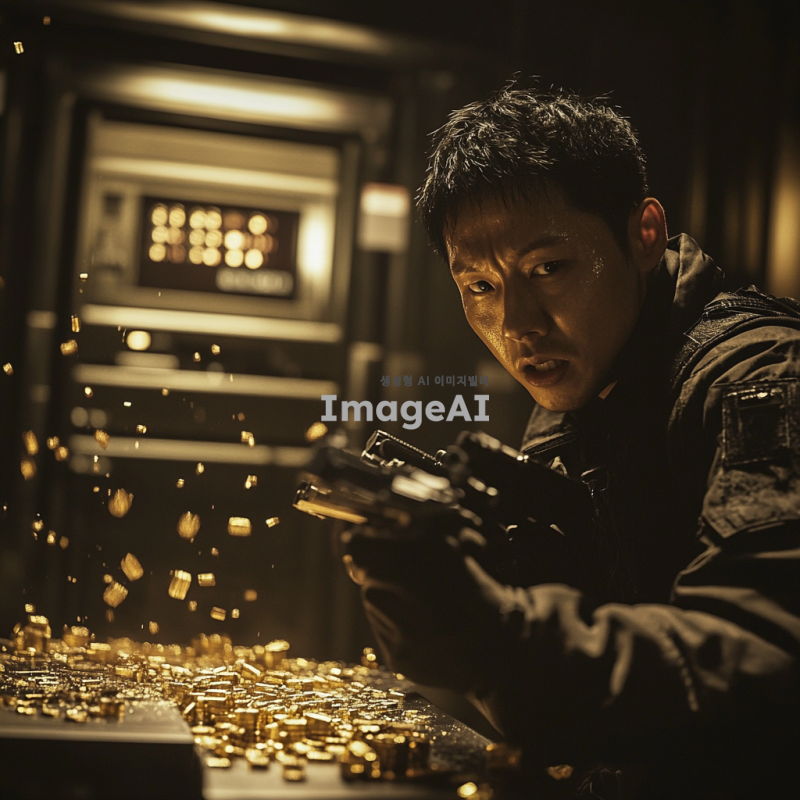 어두운 은행 금고 안, 금괴가 흩어져 있는 장면, 금괴의 반짝임이 어둠 속에서 빛나고, 긴장감 넘치는 분위기, 은행의 안전장치가 파손된 모습, 주위에 흩어진 금괴와 함께 긴장한 한국인 경비원의 표정, 사건의 긴박함을 느낄 수 있는 디테일한 배경.