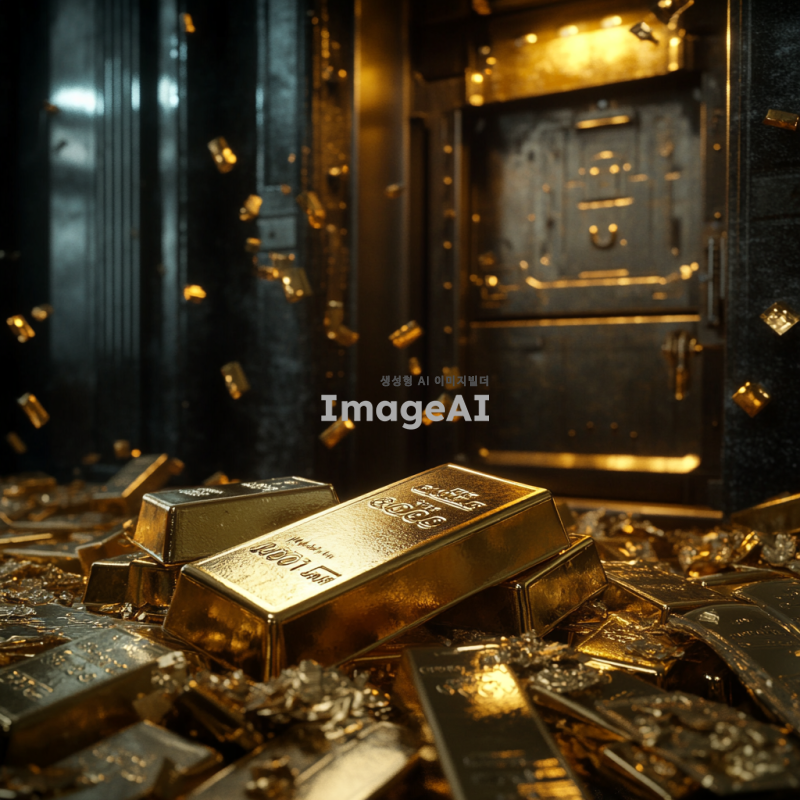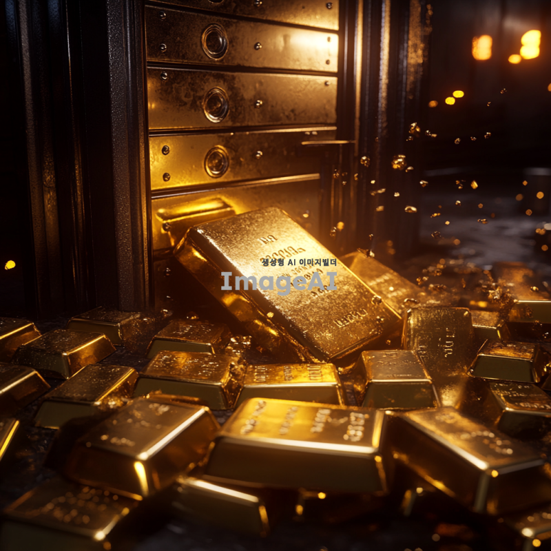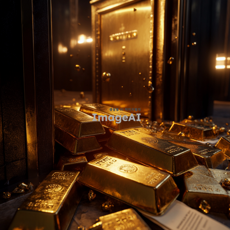 은행의 금고에서 도난당한 금괴가 흩어진 모습. 어두운 금고 안에서 금괴가 반짝이며, 주변에는 혼란스러운 분위기가 감돌고 있다. 금괴 위에는 세밀한 질감과 반사광이 잘 드러나고, 금고의 금속 문은 열려 있으며, 배경에는 어두운 그림자와 함께 은행의 고급스러운 인테리어가 보인다. 긴장감 넘치는 상황을 강조하기 위해, 주변에 흩어진 서류와 경고등이 깜빡이는 모습도 포함.