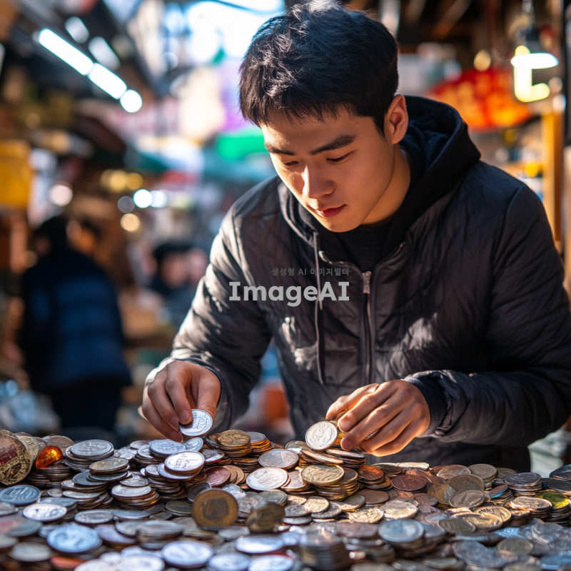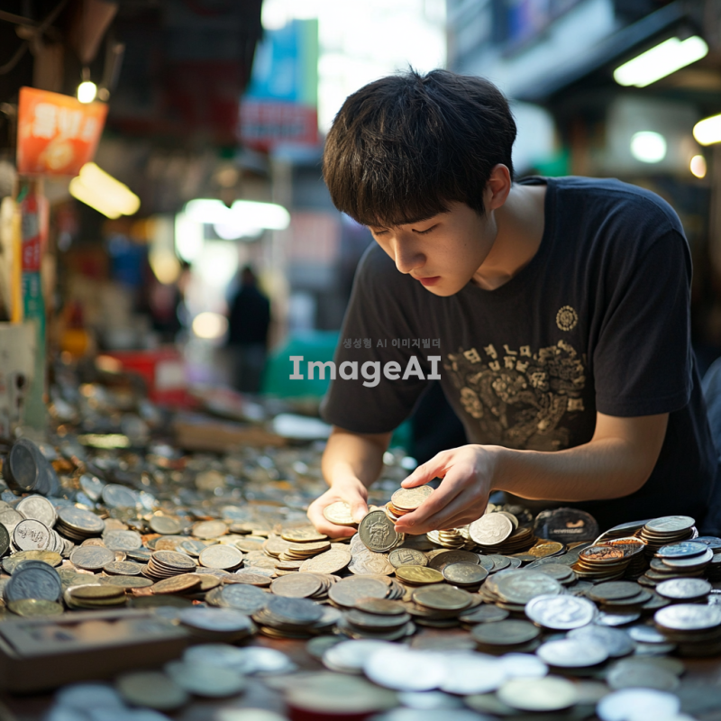 한국의 전통 시장에서 여러 종류의 코인을 정리하고 있는 젊은 남성의 모습. 그는 코인들을 손에 들고 집중해서 살펴보고 있으며, 주변에는 다양한 동전과 지폐가 흩어져 있다. 배경에는 전통적인 한국의 상점과 사람들의 모습이 보인다. 자연광이 들어와 따뜻한 분위기를 자아내고 있다.