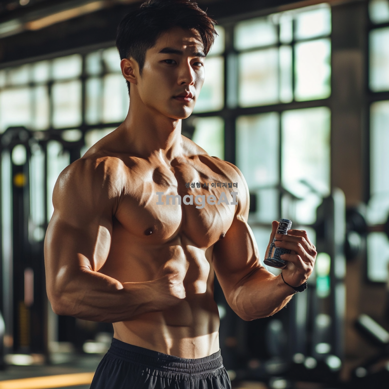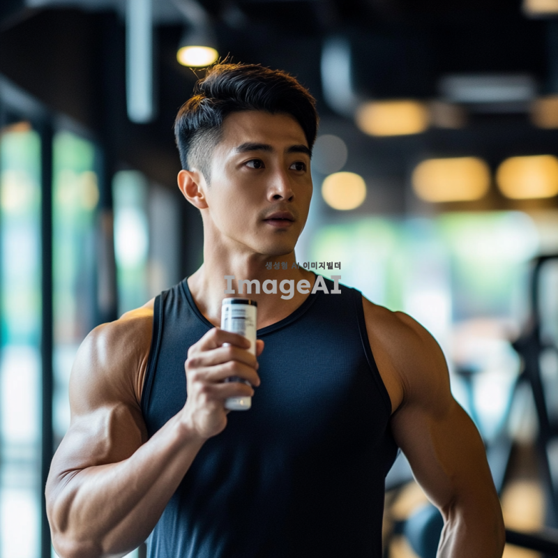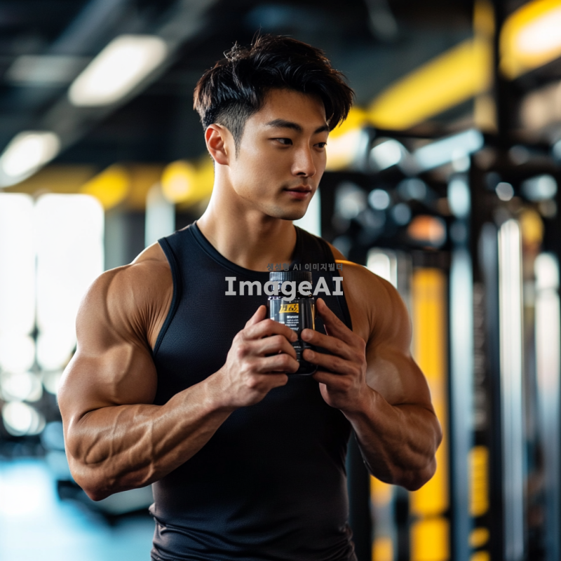 한국인 남성이 헬스장에서 크레아틴을 섭취하며 운동하는 모습, 근육이 발달한 체격, 운동복을 입고 있는 모습, 배경에는 다양한 운동 기구와 함께 활기찬 분위기, 자연광이 들어오는 창문이 있는 실내 환경, 집중한 표정으로 크레아틴을 섭취하는 장면.