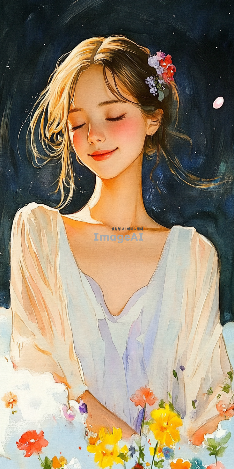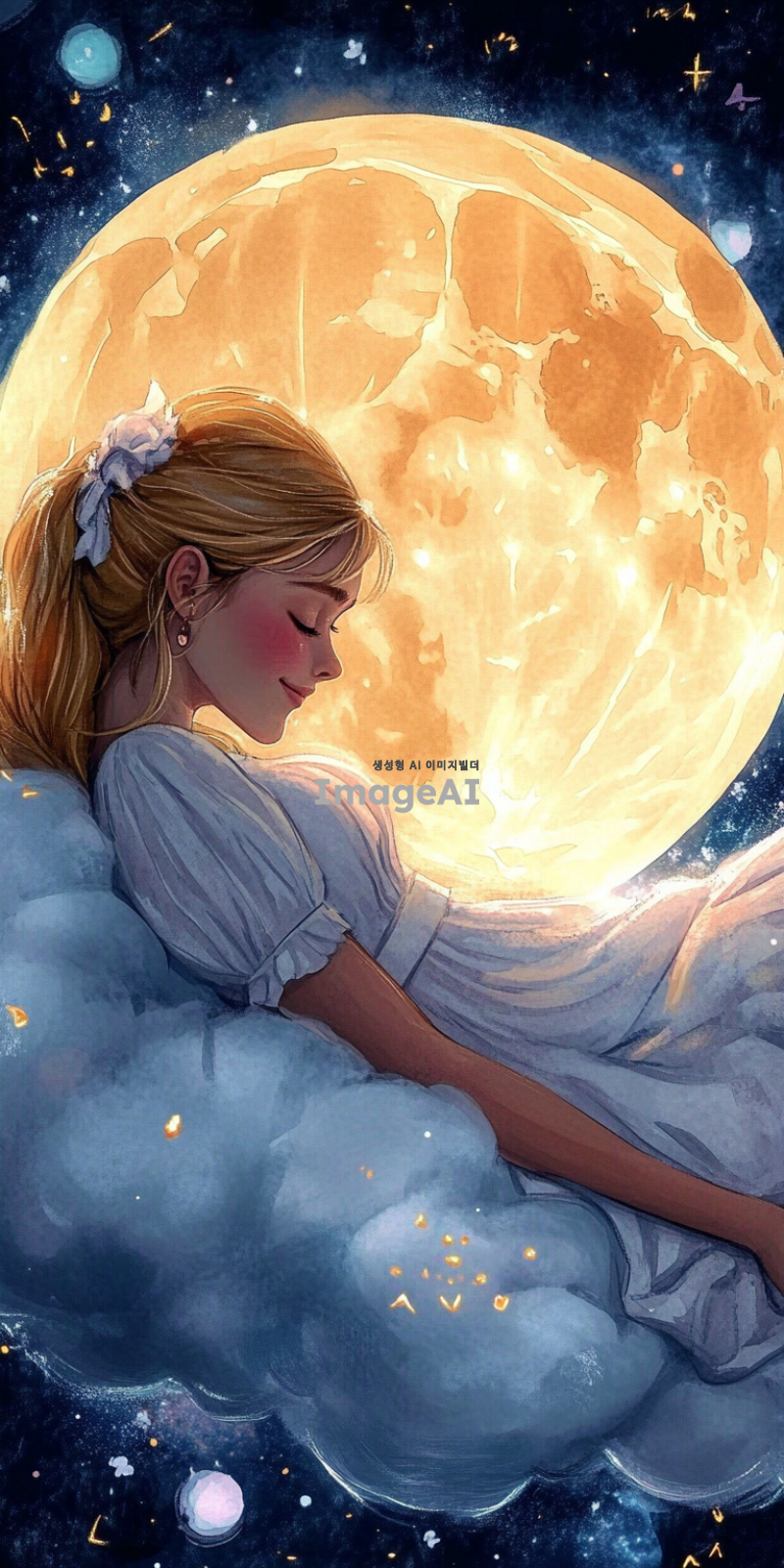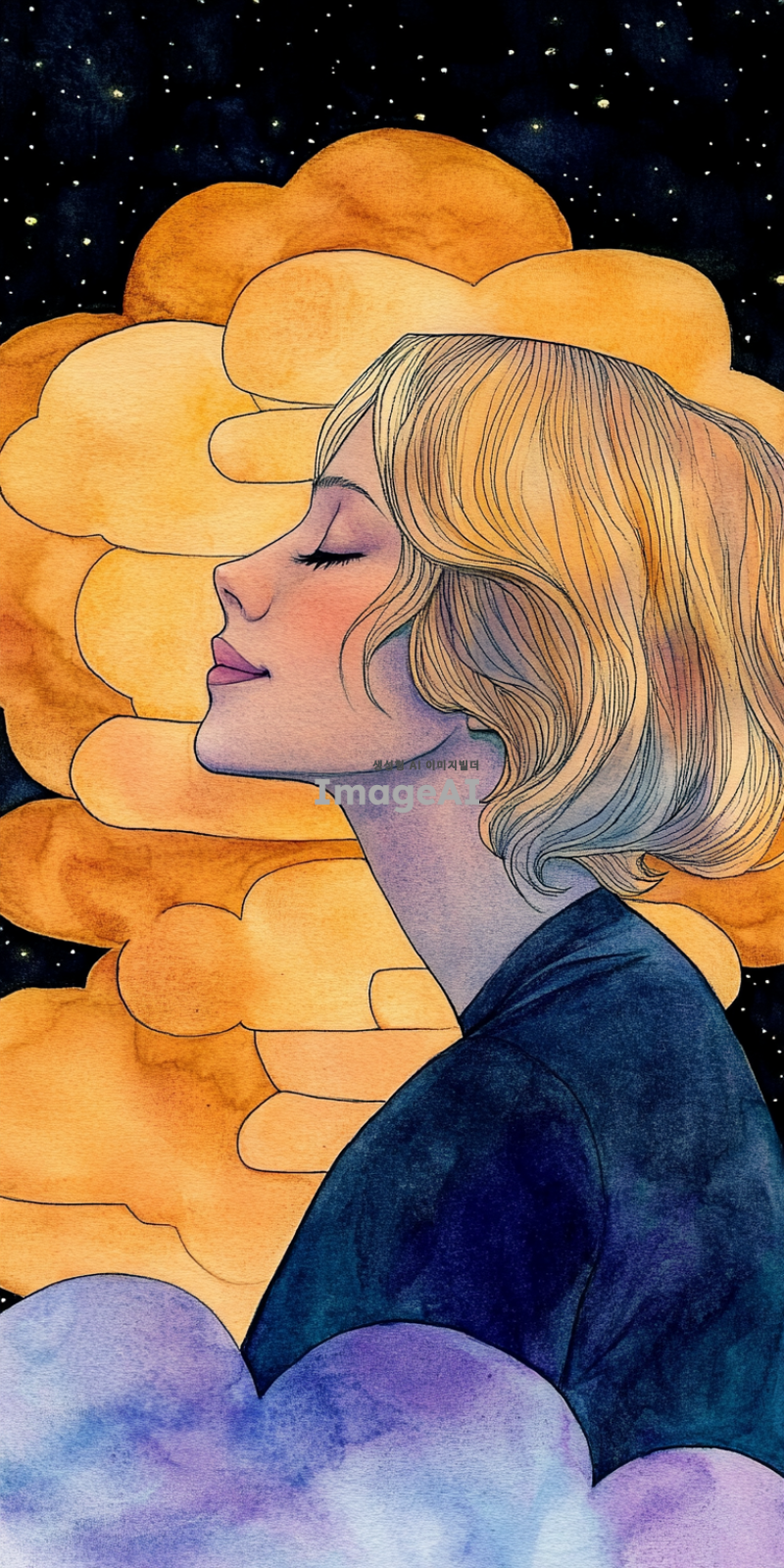 구름 위에서 잠든 금발머리 여자아이, 수채화, 동화 같은 그림체, 노랑과 보라색이 섞인 파스텔톤의 배경, 여성의 크기가 1/3, 행복한 미소를 머금은 여성의 얼굴, 일러스트, 구름에 둘러싸인 여성