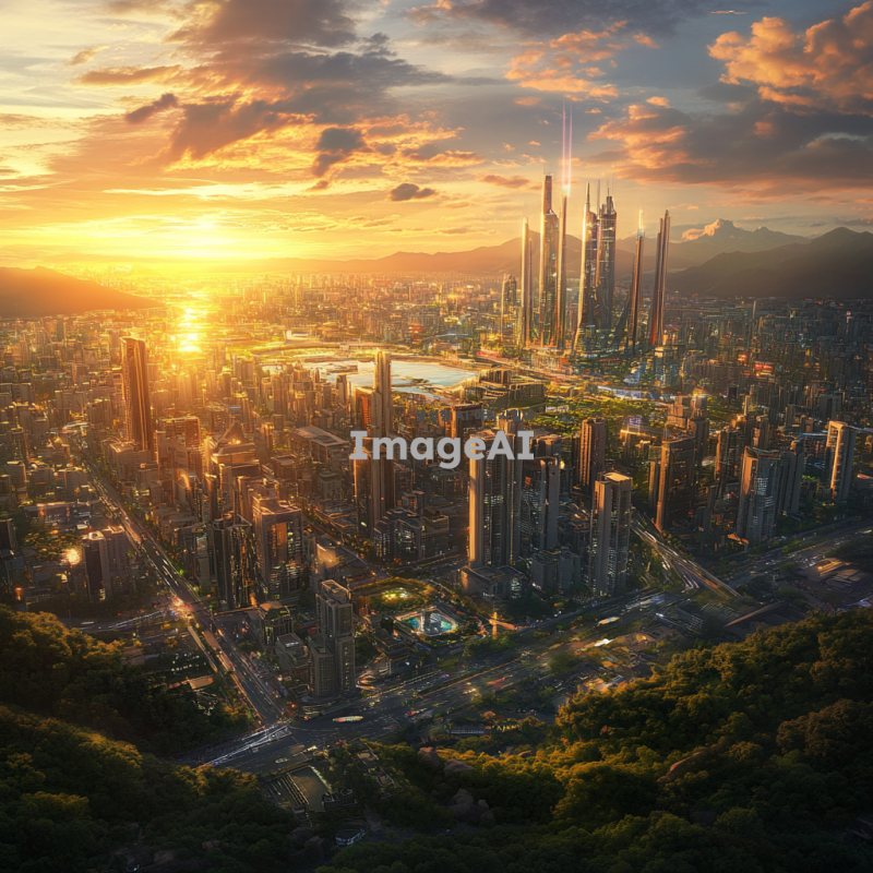 혁명적인 변화와 재탄생을 상징하는 한국의 도시 풍경, 현대적 건축물과 자연이 조화를 이루는 모습, 활기찬 사람들로 가득 찬 거리, 다양한 문화와 전통이 어우러진 장면, 희망과 에너지가 넘치는 분위기, 밝고 생동감 있는 색감, 미래 지향적인 느낌의 일출 배경.