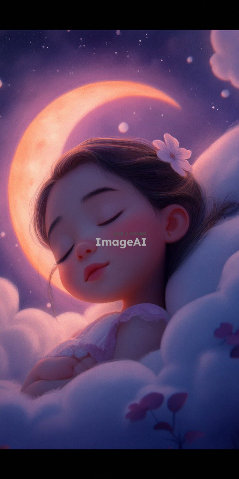 달이 자고 있고, 아기 소녀가 눈을 감고 침대에서 자고 있으며, 구름으로 둘러싸여 있다. 보라색-분홍색 그라디언트 하늘의 배경은 부드러운 빛이 비추어져 있어 평온함과 따뜻함이 가득한 분위기를 만들어낸다. 이 장면은 고화질 이미지를 제공하며, 손으로 그린 애니메이션 스타일을 통해 섬세한 질감을 보여준다. 픽사의 애니메이션 장편 영화 스타일로, 이 클로즈업은 얼굴 표정과 질감, 그리고 밤하늘의 풍경을 세밀하게 포착한다.