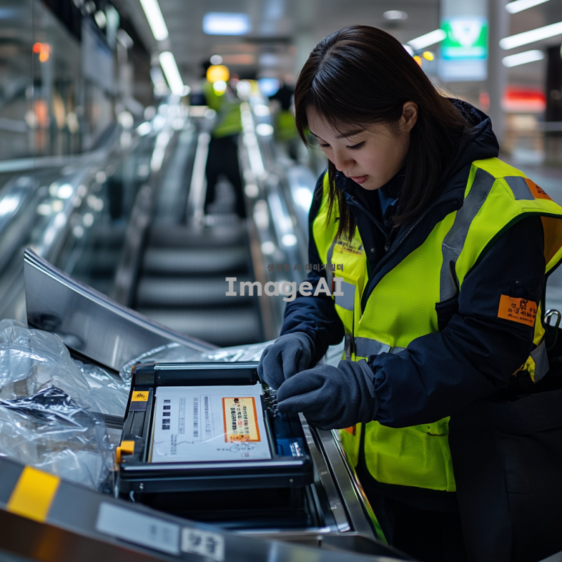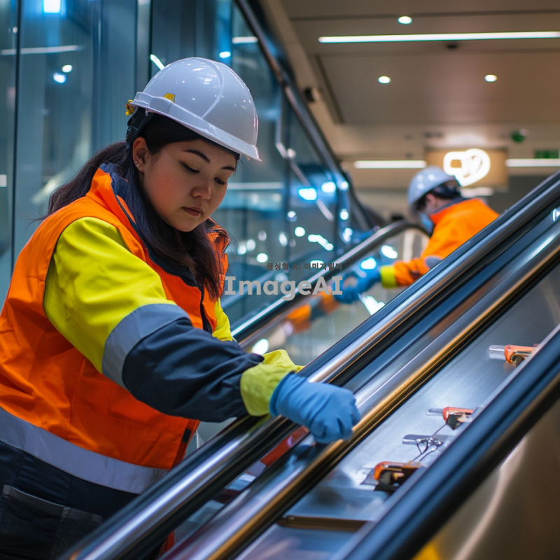 승강기안전공단의 직원들이 에스컬레이터 법정 검사를 진행하고 있는 장면. 직원들은 안전복을 착용하고 있으며, 에스컬레이터의 다양한 부품을 점검하고 있다. 주변에는 검사 장비와 도구들이 정리되어 있고, 에스컬레이터는 현대적이고 깨끗한 디자인이다. 검사 중인 직원의 표정은 진지하고 집중하고 있으며, 배경에는 승강기안전공단의 로고가 보인다.