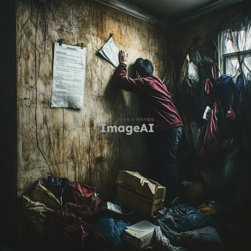 아파트 내부, 압류 통지서가 붙어 있는 벽, 긴장한 표정의 한국인 남성이 서 있는 모습, 주변에는 정리되지 않은 짐과 서류들이 흩어져 있는 장면, 어두운 조명과 우울한 분위기, 현실적인 디테일 강조.