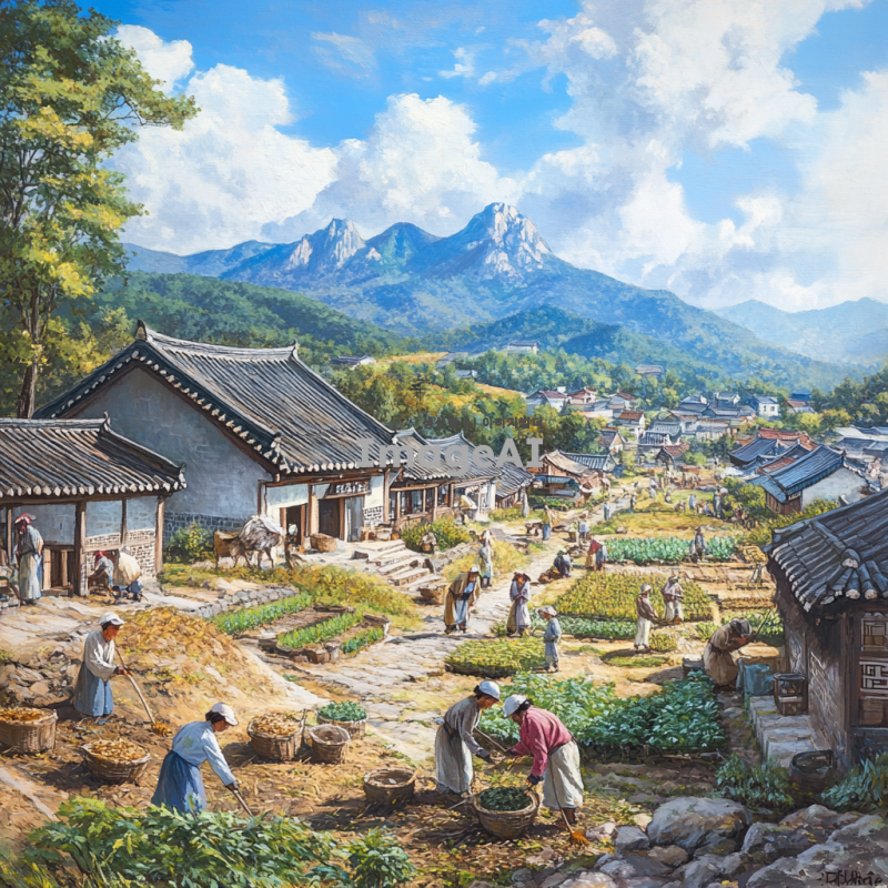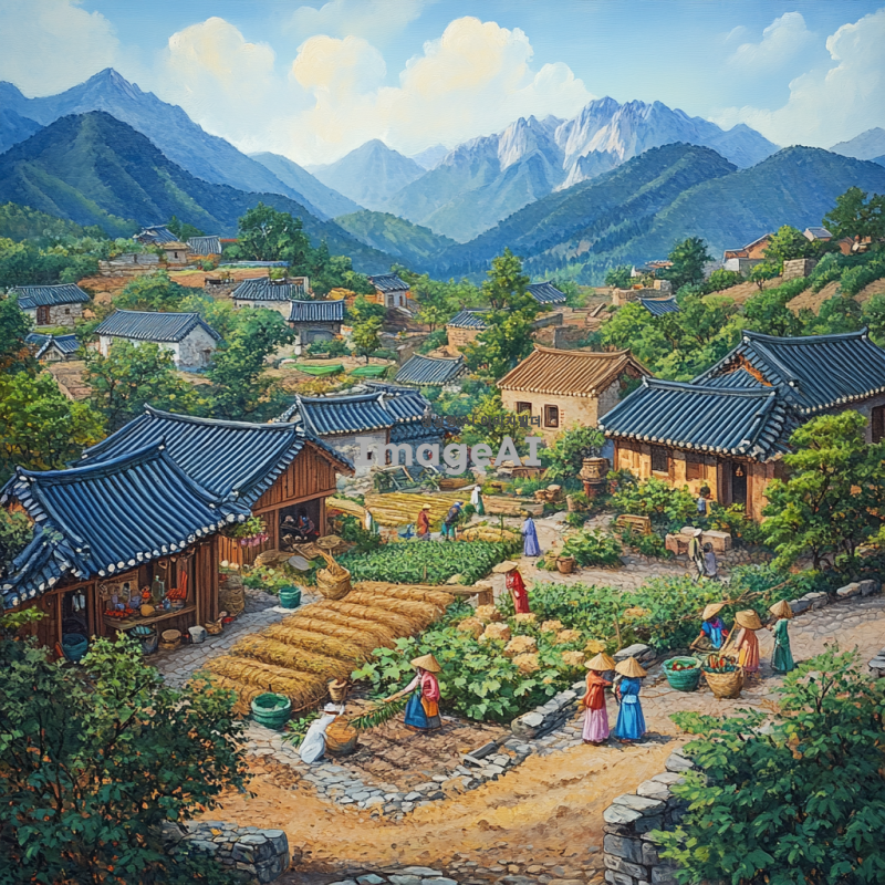 한국의 전통적인 마을 풍경, 다양한 사람들이 함께 협력하여 농작물을 수확하는 모습, 서로 돕고 소통하는 따뜻한 분위기, 배경에는 푸른 산과 맑은 하늘, 전통 가옥과 현대적인 건물이 조화롭게 어우러진 장면, 상생과 협력의 메시지를 담은 이미지.