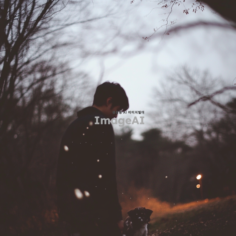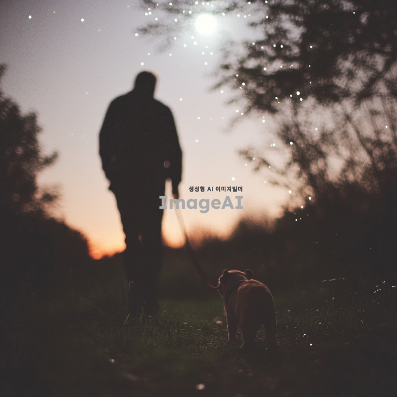어두운 밤, 별빛이 반짝이는 하늘 아래, 한국인 남성이 귀여운 강아지와 함께 산책하는 모습. 남성은 편안한 옷을 입고, 강아지는 리드줄에 매여 있으며, 주변에는 나무와 풀들이 어우러져 있는 자연 풍경. 강아지는 활기차고 호기심 가득한 표정으로 주변을 탐색하고 있다. 달빛이 부드럽게 비추는 가운데, 두 사람의 행복한 순간을 포착한 장면.