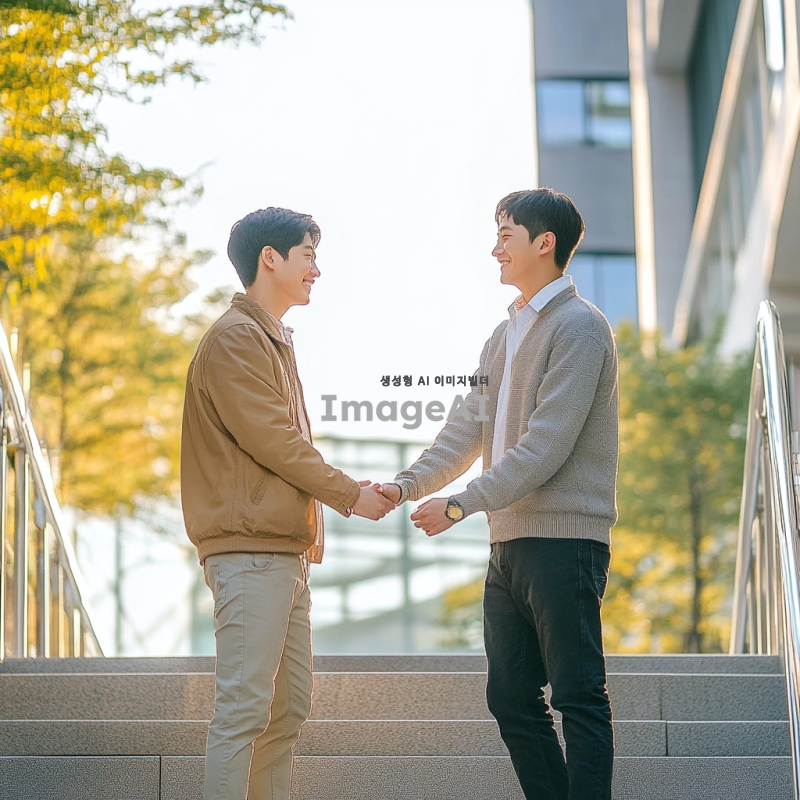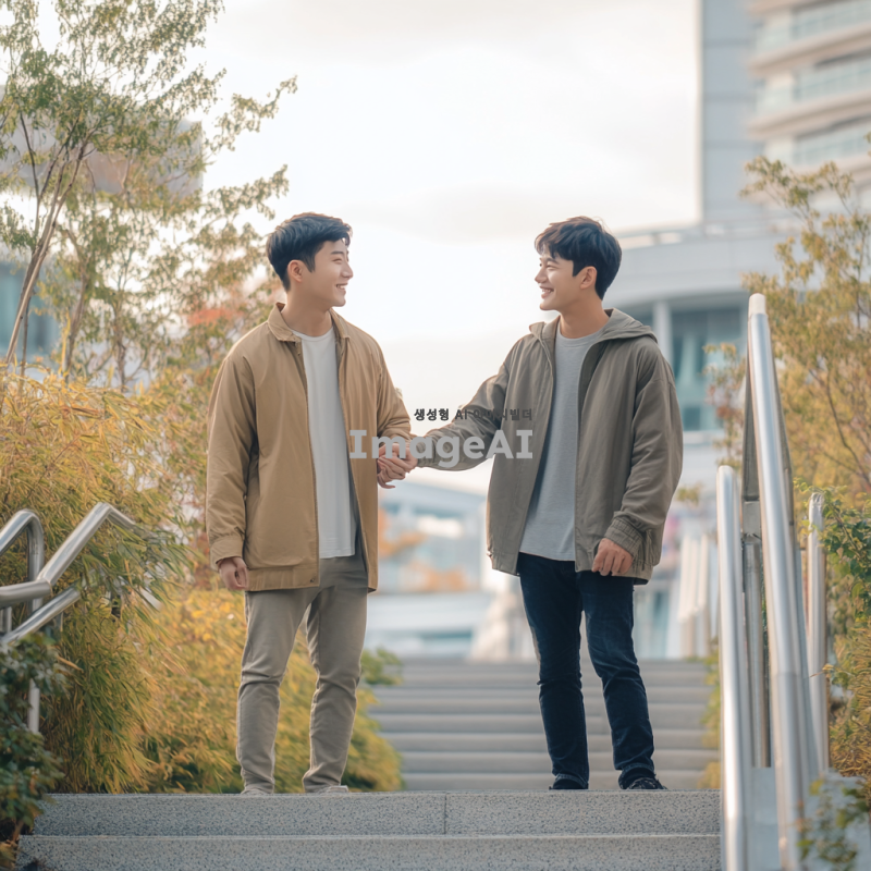 계단 제일 위에 서 있는 한국 남성이 아래에 있는 남성을 손을 잡고 도와주는 모습, 두 사람의 표정은 따뜻하고 서로를 신뢰하는 느낌, 주변은 자연광이 비추는 밝은 분위기, 배경은 현대적인 건물과 나무가 어우러진 풍경, 두 사람의 의상은 캐주얼하고 편안한 스타일, 서로의 눈을 바라보며 미소 짓고 있는 장면.