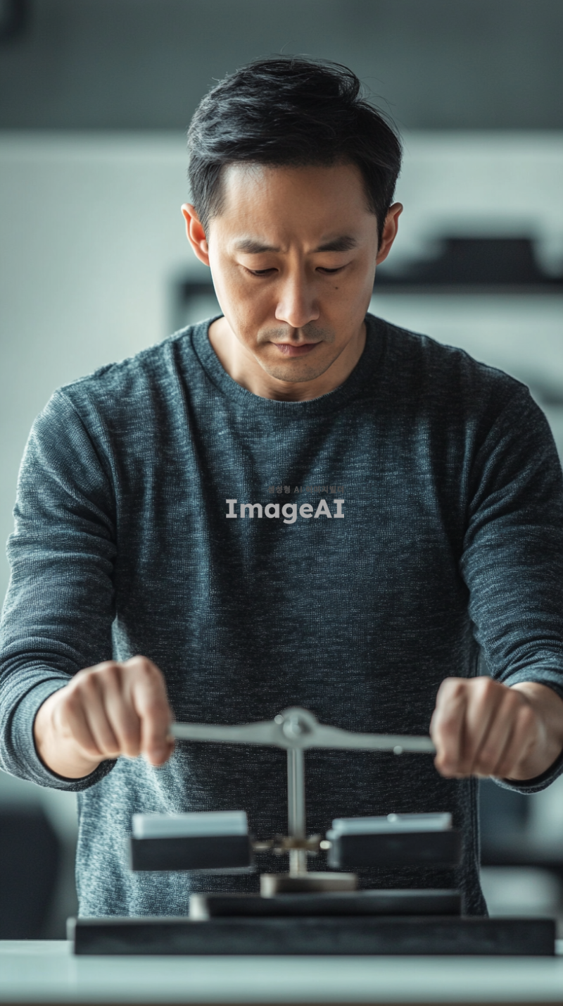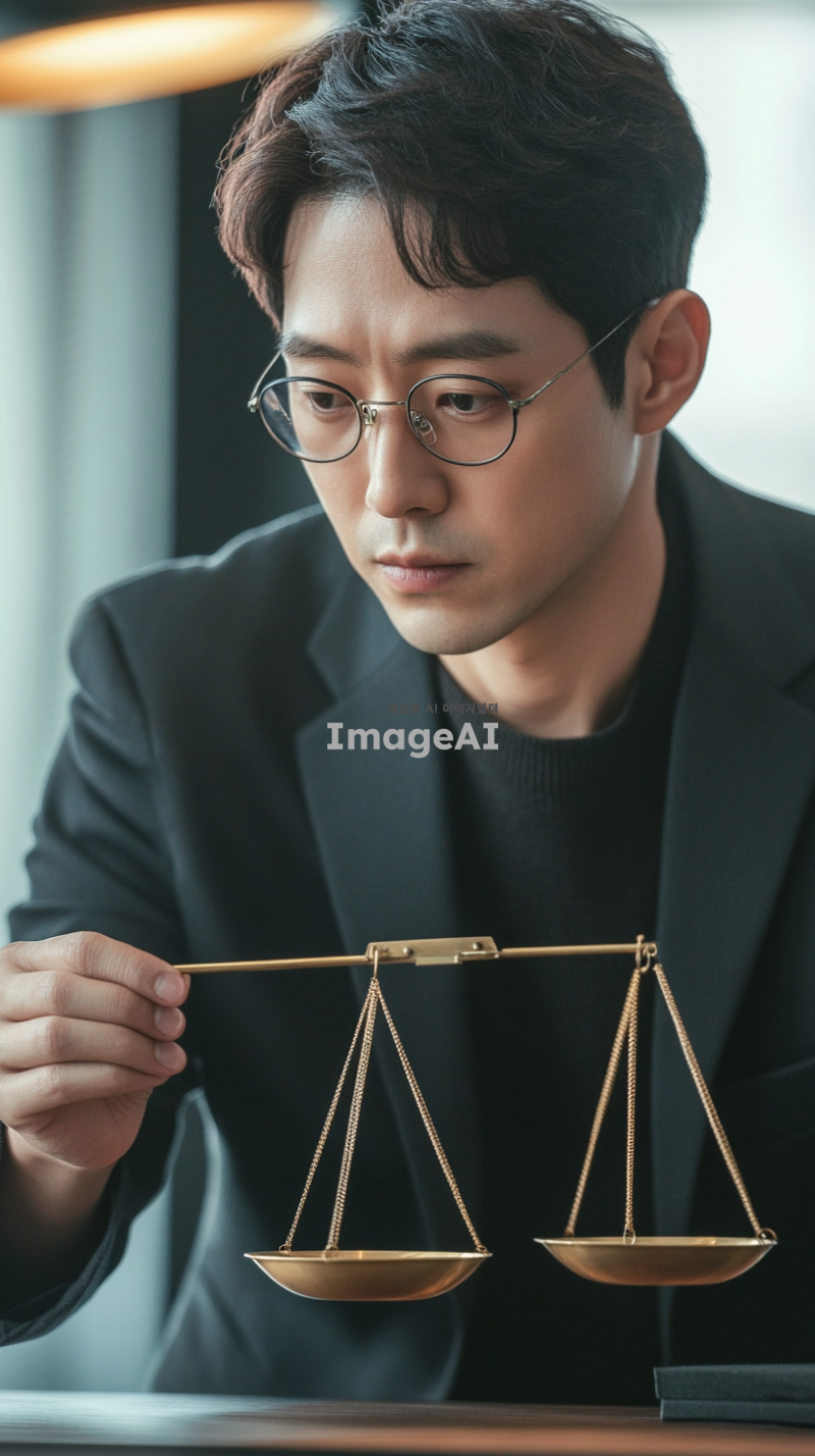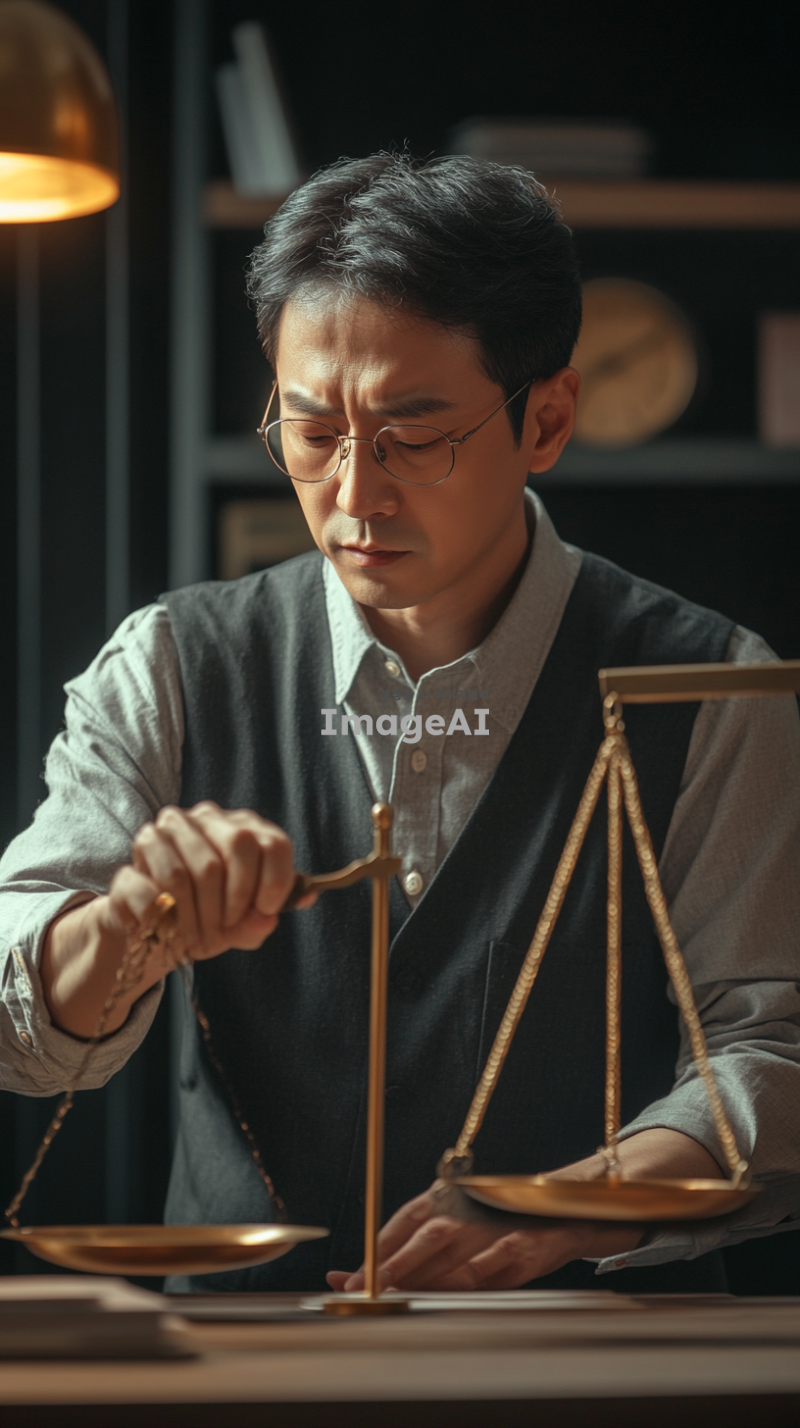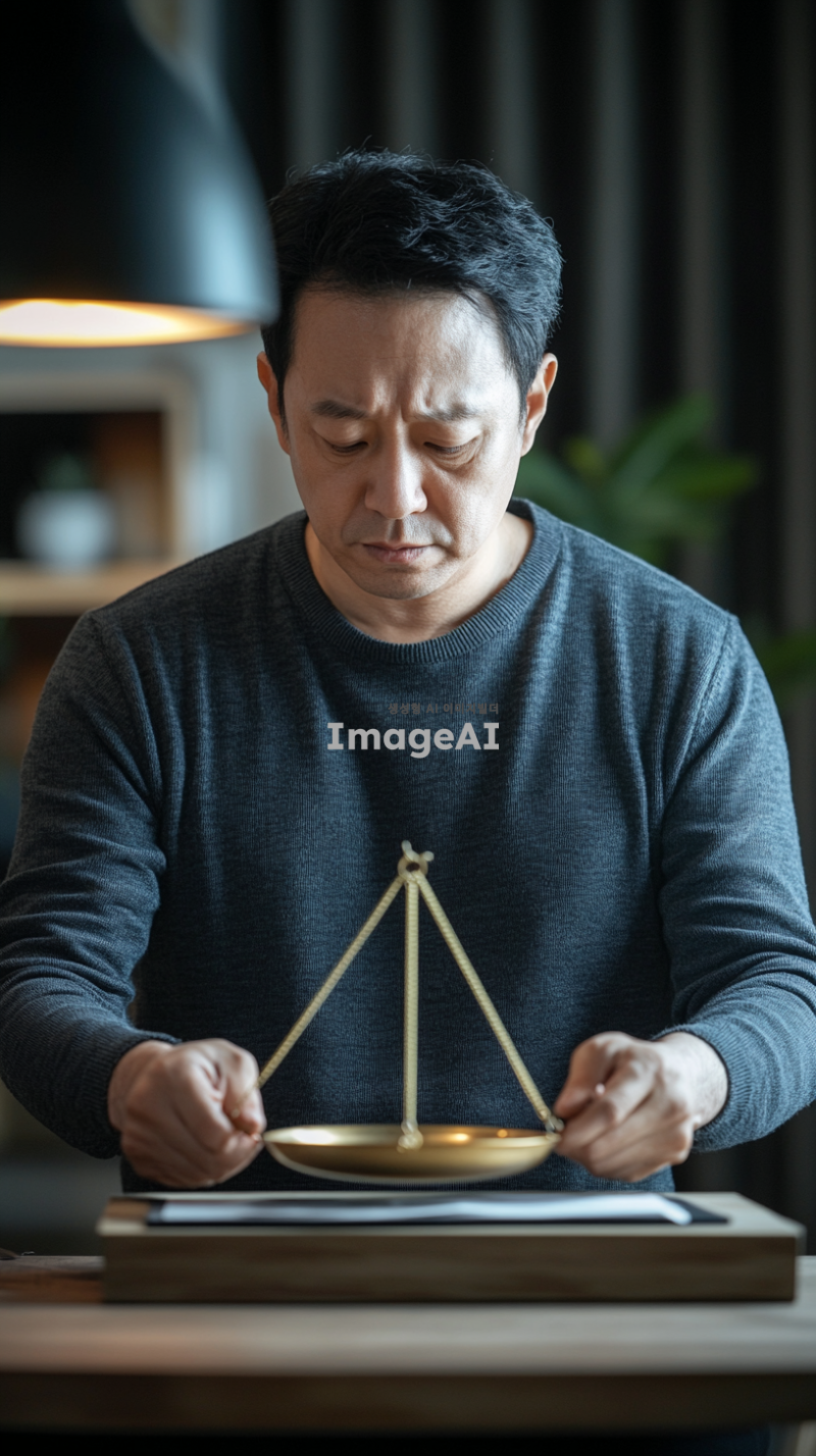 수평 저울 위에 밸런스 종신보험과 연금보험을 올려놓고 저울질을 하고 있는 모습, 배경은 부드러운 조명 아래의 현대적인 사무실, 저울의 균형을 맞추기 위해 고민하는 한국인 남성, 진지한 표정, 세밀한 디테일과 현실감 있는 표현.