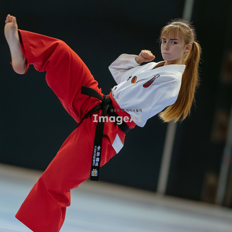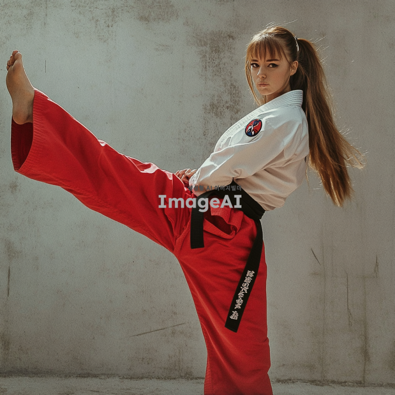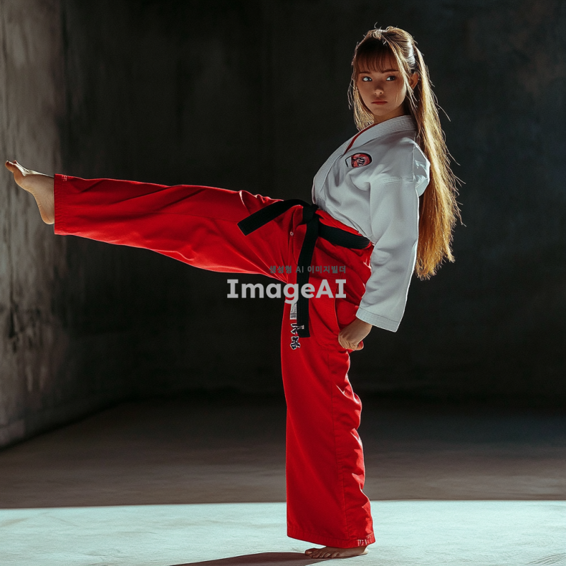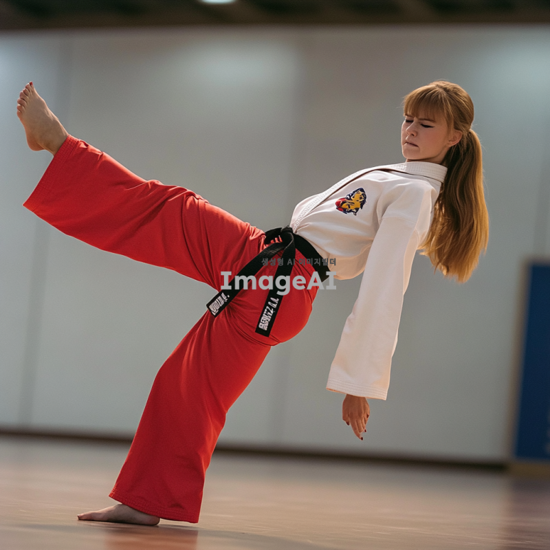 빨간색 태권도 바지를 입고 다리찢기를 하는데 고통스러운 여자