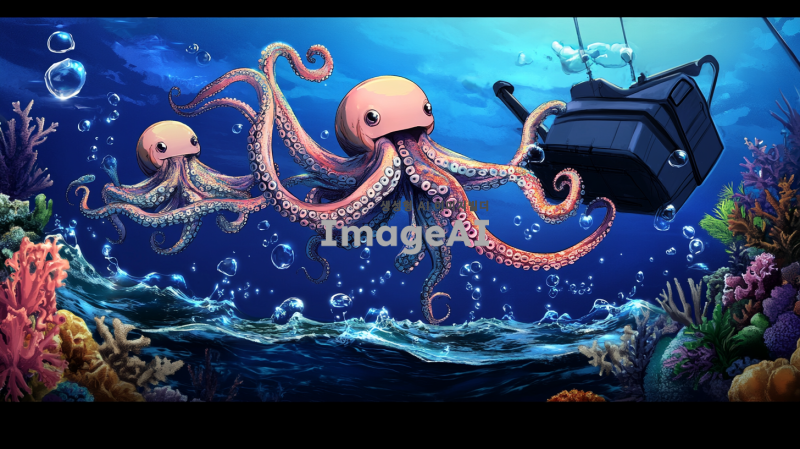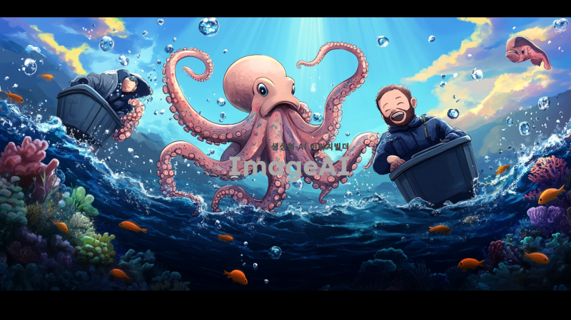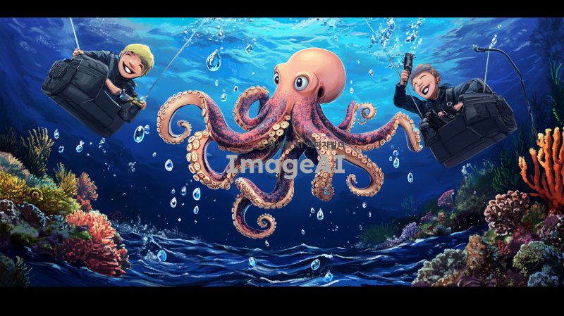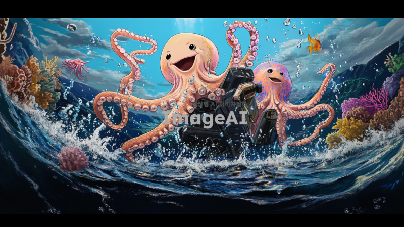 바다 속에서 튀어 오르는 쭈꾸미 세 마리의 모습. 각 쭈꾸미는 생동감 있게 표현되며, 다양한 색상과 패턴을 가진 몸체가 빛나는 수중 환경에서 흥미롭게 튀어 오르는 장면. 주변에는 물방울과 함께 바다의 다양한 해양 생물, 산호초가 배경으로 어우러져 있는 모습. 밝고 화사한 색감으로 전체적인 분위기를 즐겁고 경쾌하게 표현.