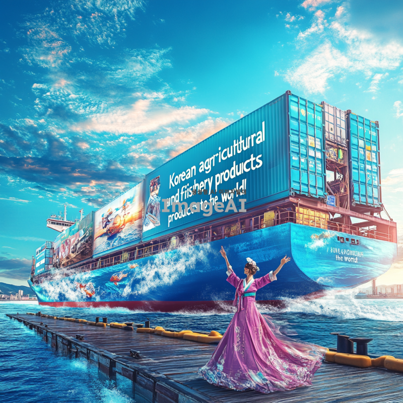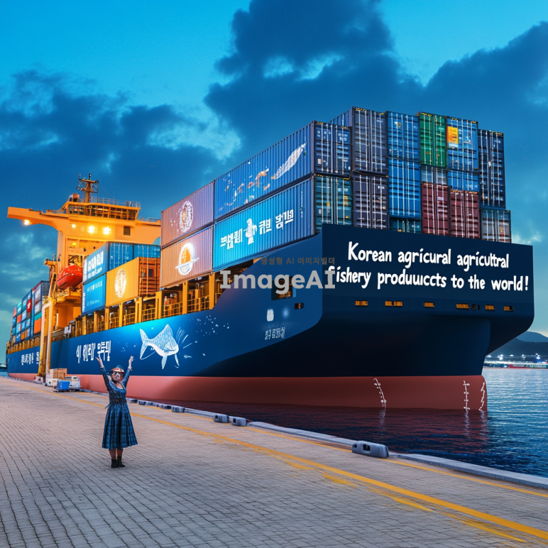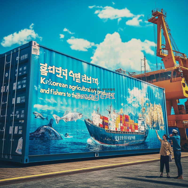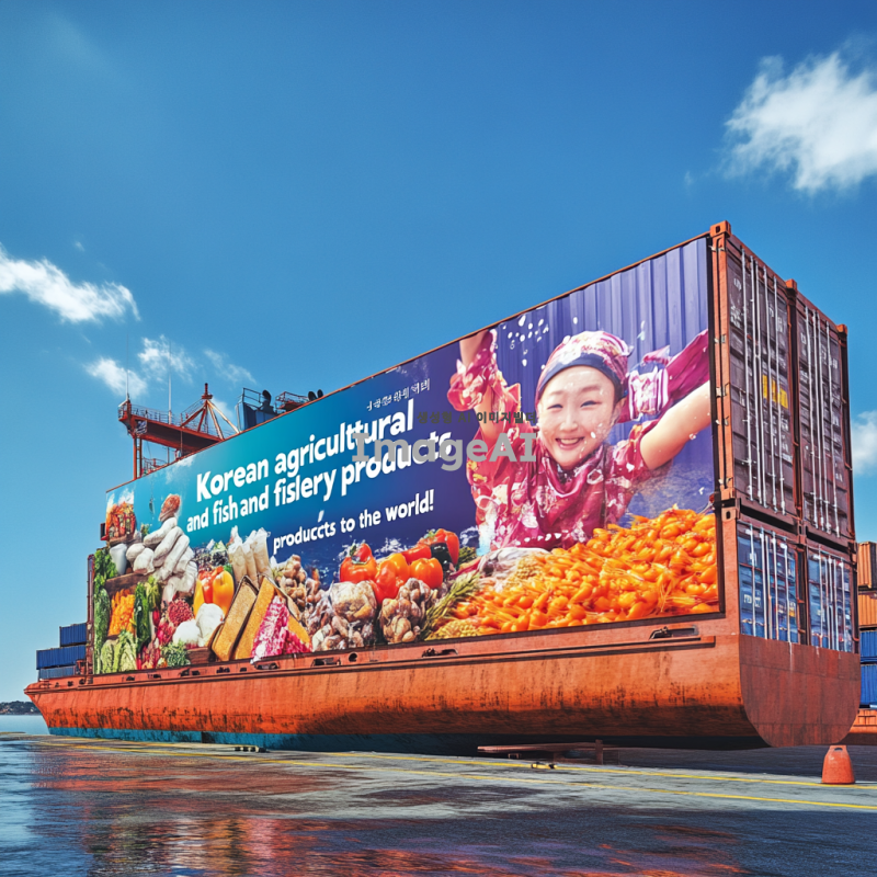 - 실제 컨테이너 선박 사진을 배경으로 하고, AI 보정을 통해 한국산 농수산물을 강조한 이미지. 컨테이너에는 "한국 농수산물 세계로!"라는 메시지를 삽입하고, 강렬한 색감으로 파란 바다와 한국산 제품의 선명한 컬러를 조화롭게 표현하여 시선을 끌도록 구성.