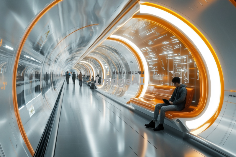 미래의 지하철 내부와 외부 모습, 첨단 기술이 접목된 디자인, 유리와 금속 소재로 이루어진 구조, 다양한 인공지능 안내 시스템, 고속 이동을 위한 레일, 승객들이 편안하게 앉아 있는 모습, 역사적인 요소가 가미된 장식, 조명은 부드럽고 현대적인 느낌, 미래 도시 풍경과 어우러진 모습, 한국의 전통적인 요소와 현대적 디자인이 조화를 이루는 지하철역.