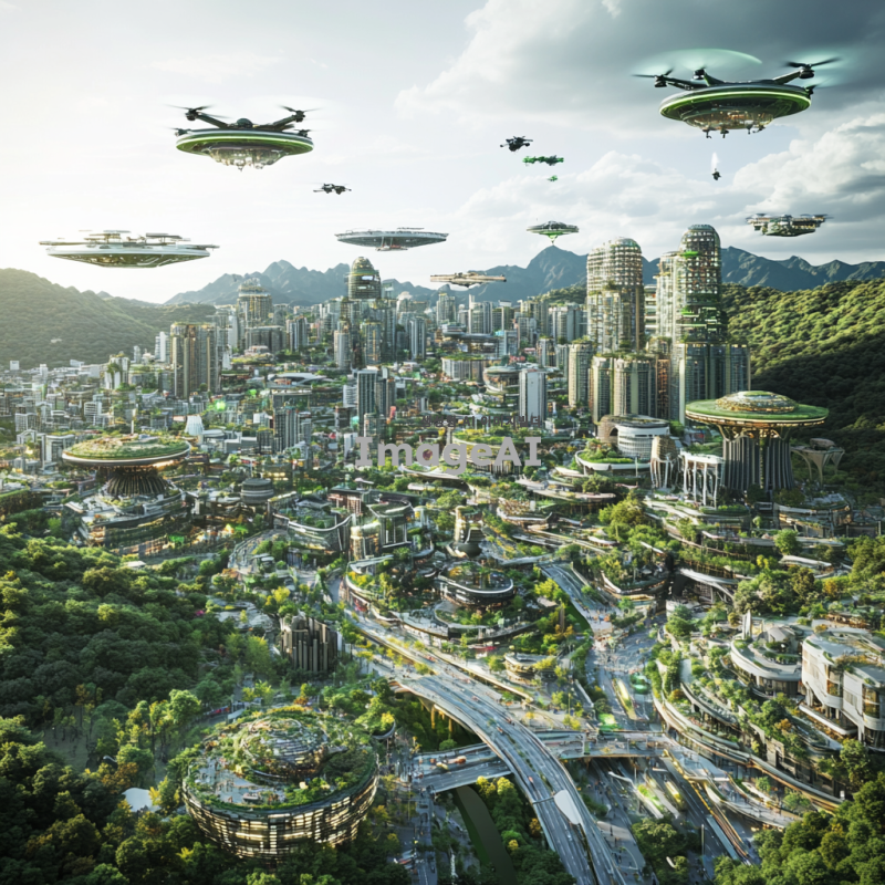 미래의 도시 풍경, 첨단 기술이 접목된 모습, 다양한 사람들과 문화가 어우러진 장면, 푸른 자연과 조화롭게 공존하는 건축물, 하늘을 나는 드론과 스마트 교통수단, 희망찬 분위기, 한국의 전통 요소가 현대적으로 재해석된 모습, 밝고 생동감 넘치는 색감, 미래 지향적인 디자인.