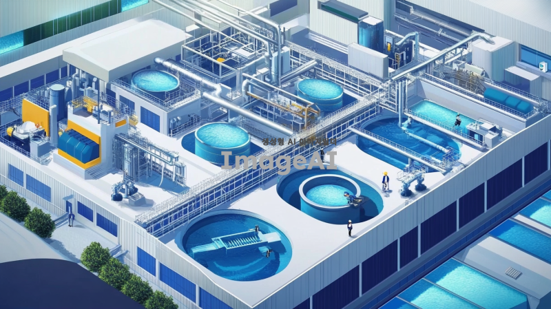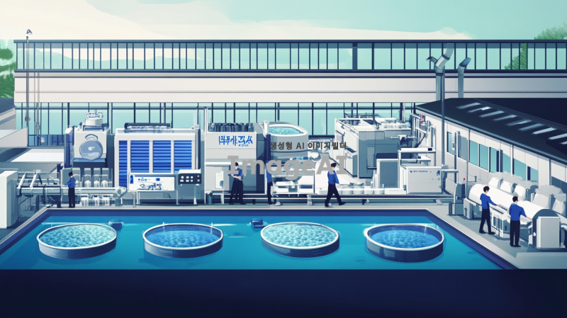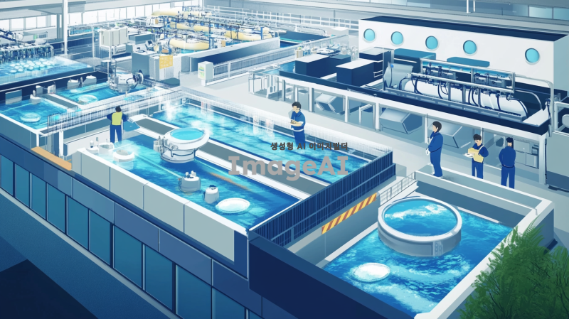 스마트 양식장에서 기계를 관리하고 있는 한국인 직원들이 있는 장면. 공장처럼 넓고 현대적인 양식장 내부, 다양한 기계와 장비가 배치되어 있는 모습. 직원들은 작업복을 입고 집중하여 기계를 점검하거나 조작하고 있으며, 서로 소통하는 모습이 담겨있음. 배경에는 양식장 내부의 구조와 기계들이 잘 보이도록 구성.