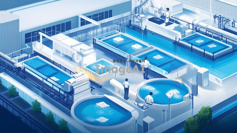 스마트 양식장에서 기계를 관리하고 있는 사람들 그려줘 스마트 양식장은 공장처럼 큰 곳으로 그려줘