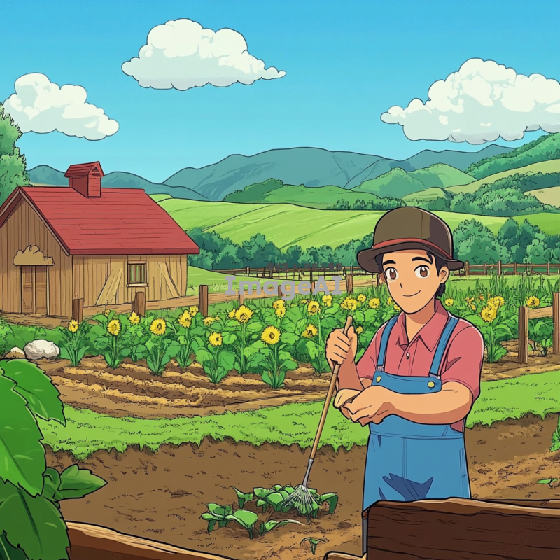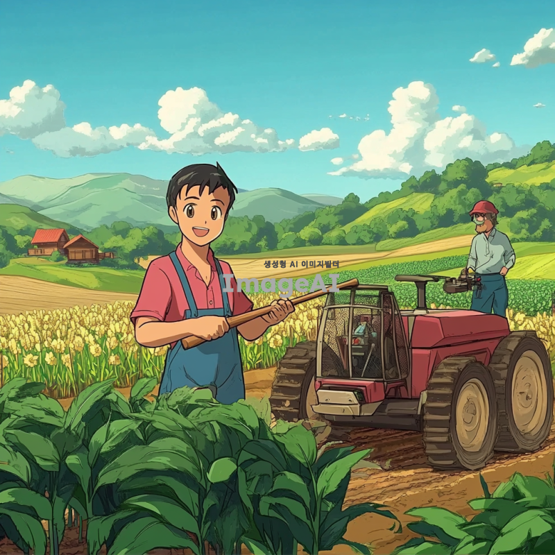 멀리서 농사를 짓고 있는 농부 3~4명을 표현하되, 한명은 첨부한 이미지와 똑같은 사라을 사용해야합니다
