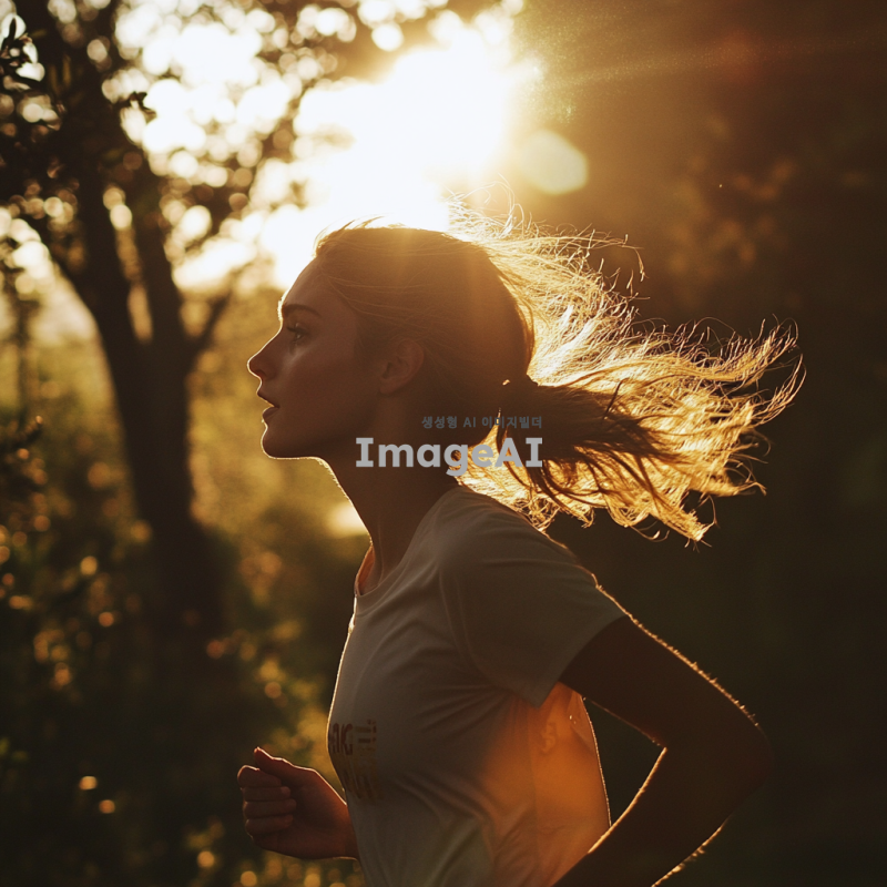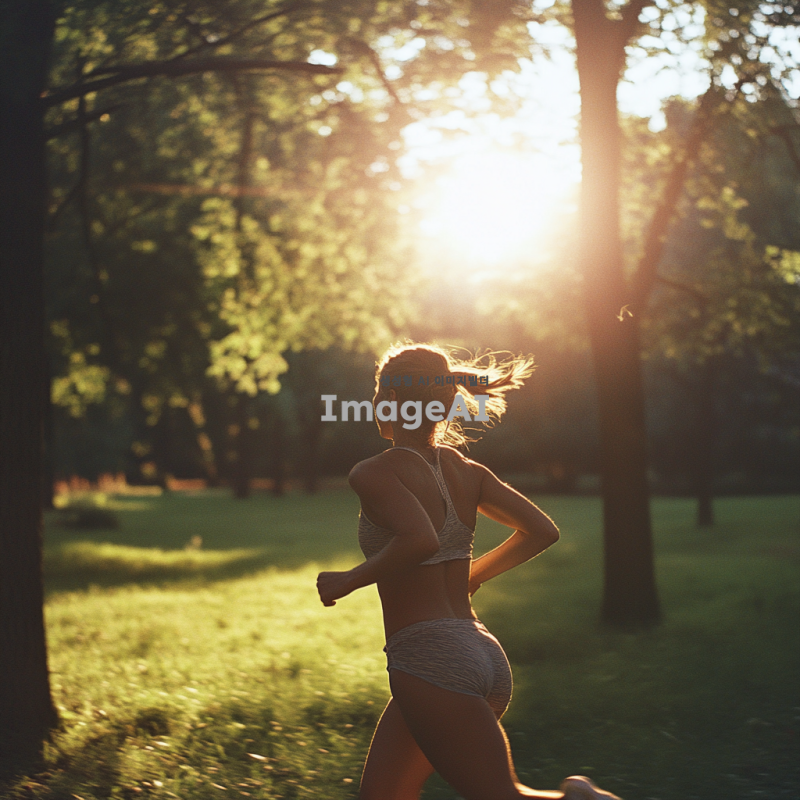 조명은 자연광으로, 햇살이 강렬하게 비추며 여자의 피부를 빛나게 하고 있습니다. 분위기는 경쾌하고 활기차며, 여름의 즐거운 느낌이 가득합니다. 카메라는 여성을 따라 달리며, 중간 샷에서 시작해 점차 클로즈업으로 전환되어 여자의 표정과 역동적인 움직임을 강조합니다. 카메라의 움직임은 부드럽고 자연스럽게, 여성이 달리는 방향으로 이동하며 그녀의 에너지를 전달합니다.