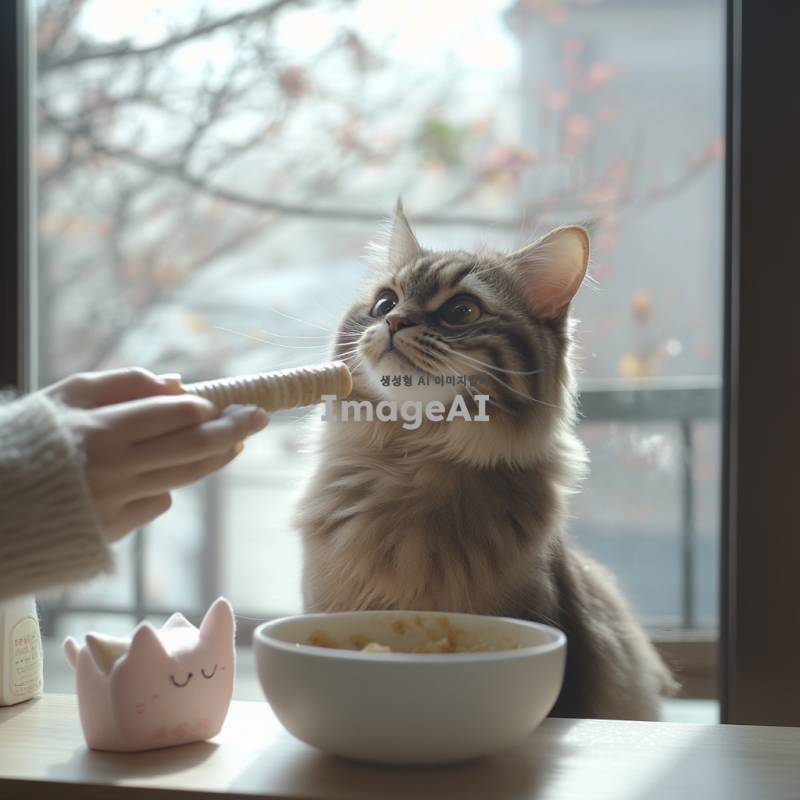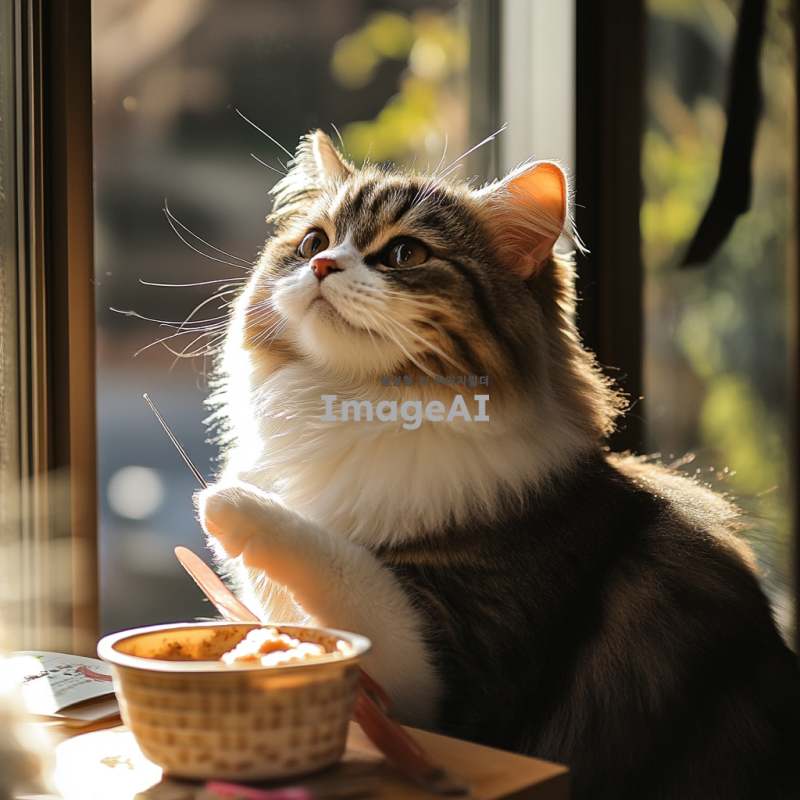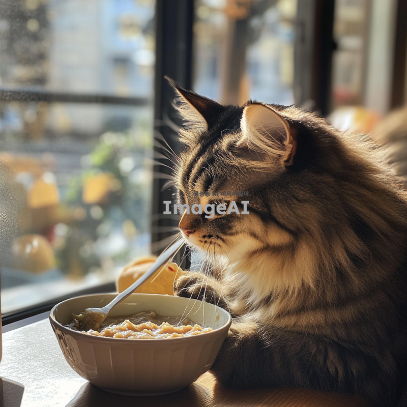 사료를 먹고 있는 한국 고양이가 그릇에 담긴 사료를 맛있게 먹고 있는 장면, 주변에는 아기자기한 장난감들이 놓여 있어 귀여운 분위기를 연출.