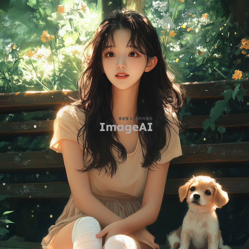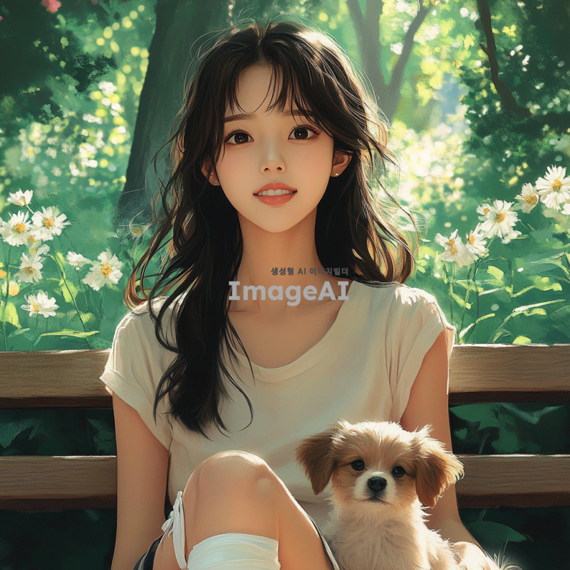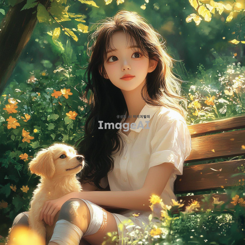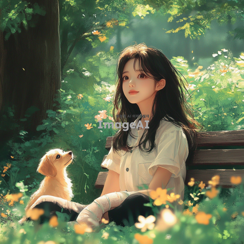 다리를 다친 한국인 여자가 공원 벤치에 앉아있는 모습을 만화 스타일로 그려주세요. 그녀는 슬픈 표정을 짓고 있으며, 다리에 깁스를 하고 있습니다. 주변에는 푸른 나무와 꽃들이 만발해 있고, 따뜻한 햇살이 비추고 있습니다. 여자의 옆에는 작은 강아지가 앉아있어 그녀를 위로하는 듯한 모습입니다. 전체적인 분위기는 따뜻하고 감정이 담긴 장면입니다.