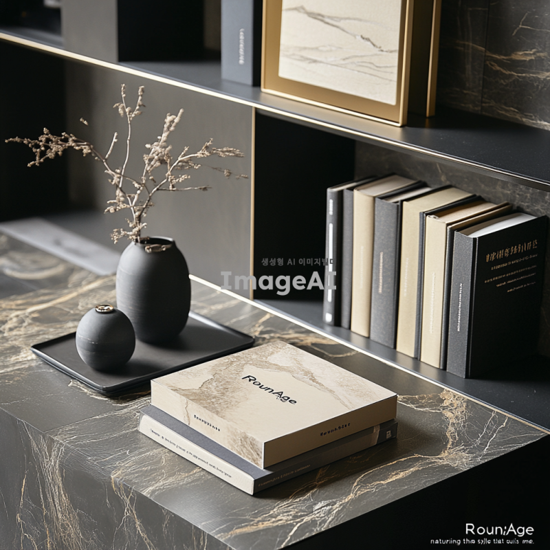 고급스럽고 자연스러운 세련됨을 표현한 컬러 팔레트를 배경으로, 신뢰감과 안정감을 주는 클래식한 느낌의 딥 네이비와 부드럽고 따뜻한 감성을 지닌 웜 베이지를 조화롭게 배치한 이미지. "RounAge"라는 브랜드 이름이 하나의 흐름처럼 연결된 형태로, 세리프 계열 폰트를 사용하여 클래식하면서도 현대적인 감각을 유지하는 로고 디자인. 감각적이고 신뢰감 있는 큐레이션 전문가의 느낌을 강조하며, "자연스럽게 나에게 맞는 스타일을 찾는다"는 메시지를 전달하는 공간의 이미지. 모던과 클래식의 조화가 잘 드러나고, 세련된 무드를 가진 스타일을 찾는 공간을 표현.