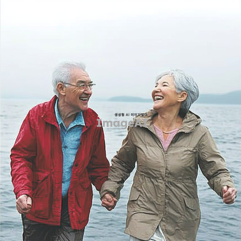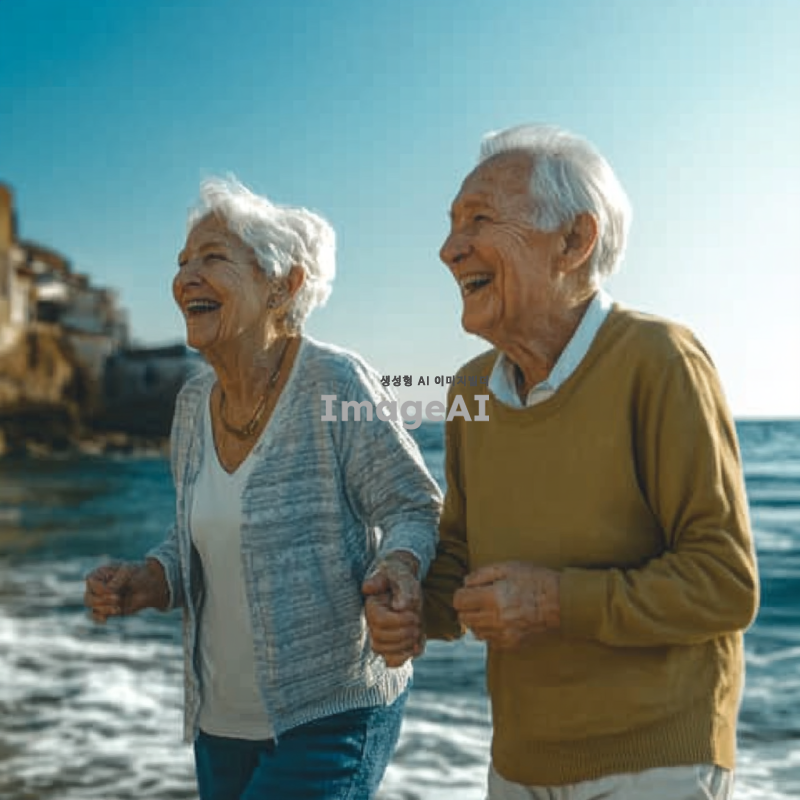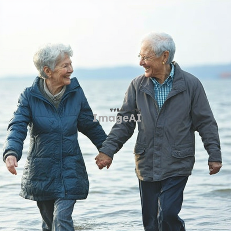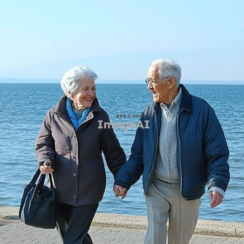 바닷가를 손잡고 걸어가는 노부부, 따뜻한 햇살 아래에서 미소를 지으며 서로를 바라보는 모습, 부드러운 파도 소리와 함께 평화로운 분위기, 배경에는 푸른 바다와 맑은 하늘, 노부부의 편안한 복장과 자연스러운 표정 강조
