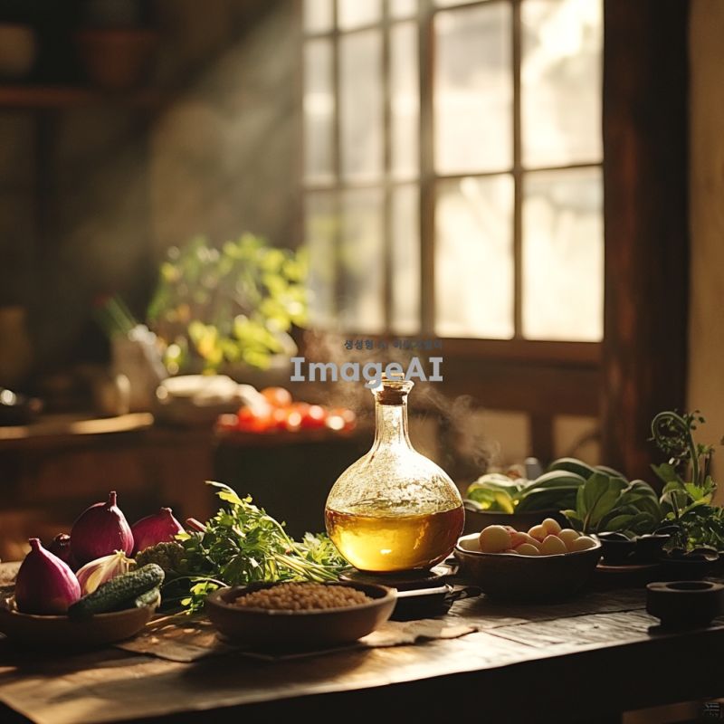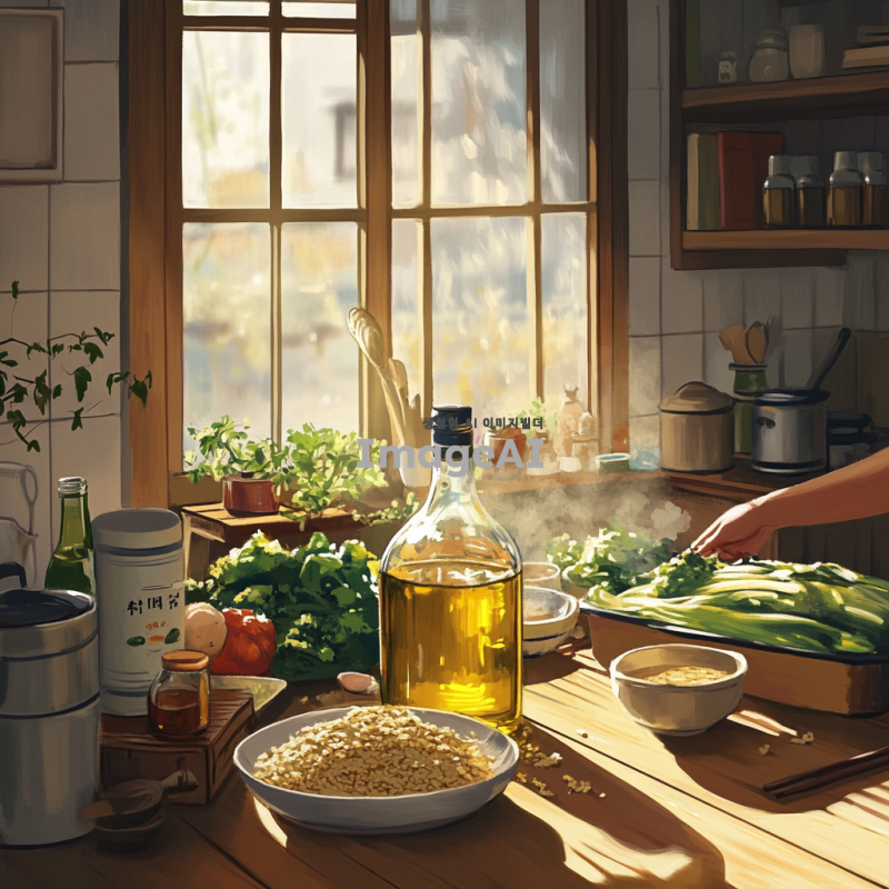 한국 전통 주방에서 참기름을 사용하는 모습, 고소한 향이 나는 참기름 병이 식탁 위에 놓여 있고, 주변에는 신선한 채소와 함께 요리하는 손길이 보인다. 자연광이 들어오는 창가에서 따뜻한 분위기가 느껴지며, 참기름이 담긴 유리병의 세밀한 질감과 색상이 강조된 장면.