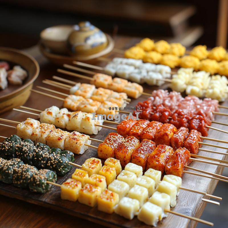 한국 전통 떡을 꼬치에 끼우는 모습, 다양한 색상의 떡이 정갈하게 배열되어 있는 모습, 손으로 꼬치에 떡을 조심스럽게 끼우는 장면, 부드럽고 촉촉한 떡의 질감, 따뜻한 조명 아래에서 촬영된 자연스러운 분위기, 배경에는 전통적인 한국식 테이블과 소품이 있는 장면