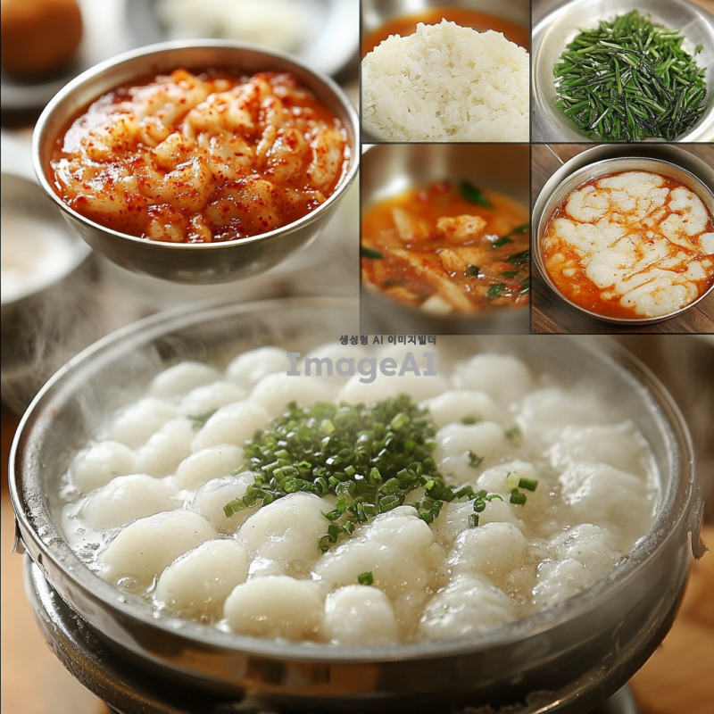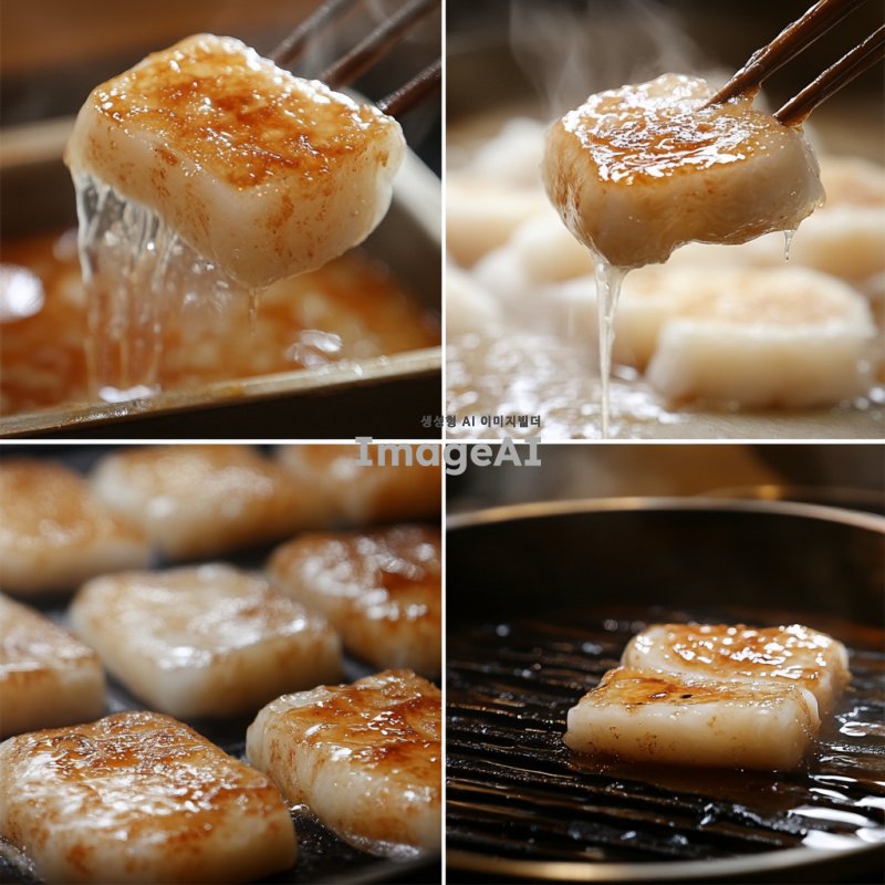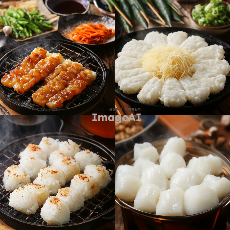 떡꼬치를 만드는 과정, 재료 준비과정, 떡을 삶는 장면 , 소스를 만드는 장면, 꼬치에 끼우는 장면, 소스를 바르는 장면, 떡을 굽는 모습, 접시에 담응 모습