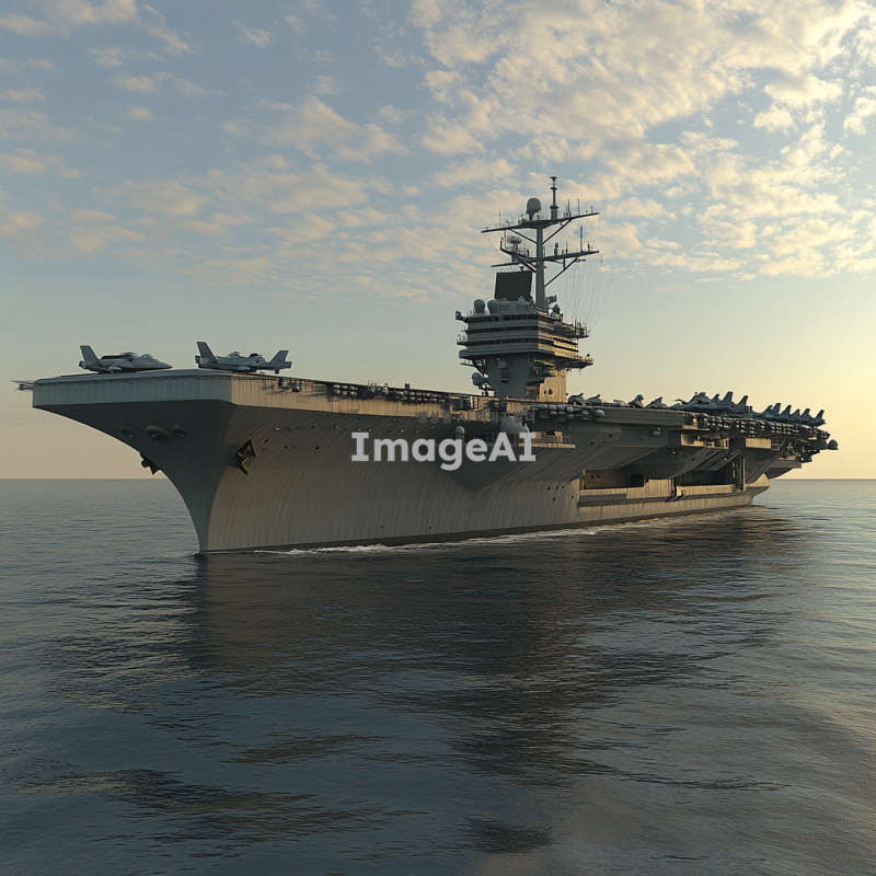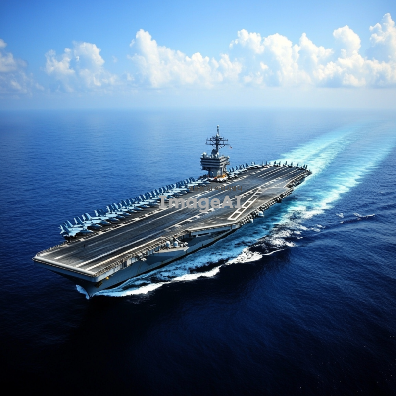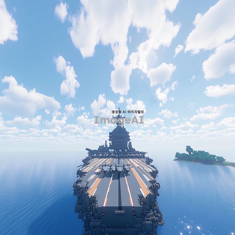 정중앙에 4개의 활주로가 있는 거대 항공모함의 함교를 중심으로, 양쪽에 약간의 공간을 두고 각각 2개의 활주로가 평행하게 배열된 모습. 항공모함의 세부적인 디자인은 현대적이고 강력한 느낌을 주며, 바다 위에서 항해 중인 모습. 주변에는 푸른 하늘과 함께 구름이 흘러가고, 항공모함의 표면은 세련된 색상으로 도색되어 있는 장면.