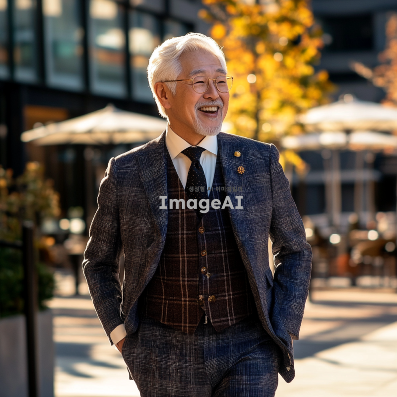 활기차고 세련된 스타일의 한국인 시니어 남성이 고급스러운 정장을 입고 도시의 현대적인 풍경 속에서 여유롭게 산책하는 모습, 밝은 햇살 아래에서 미소를 짓고 있는 모습, 럭셔리한 액세서리와 함께 세련된 분위기를 강조, 배경은 고급 레스토랑과 고층 빌딩이 어우러진 도심 풍경.