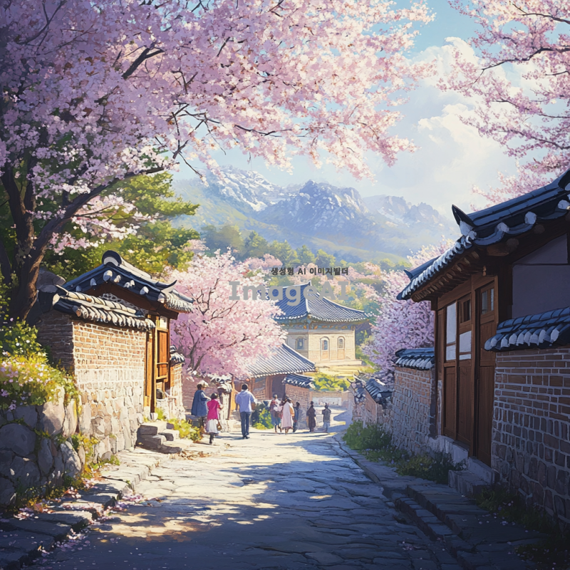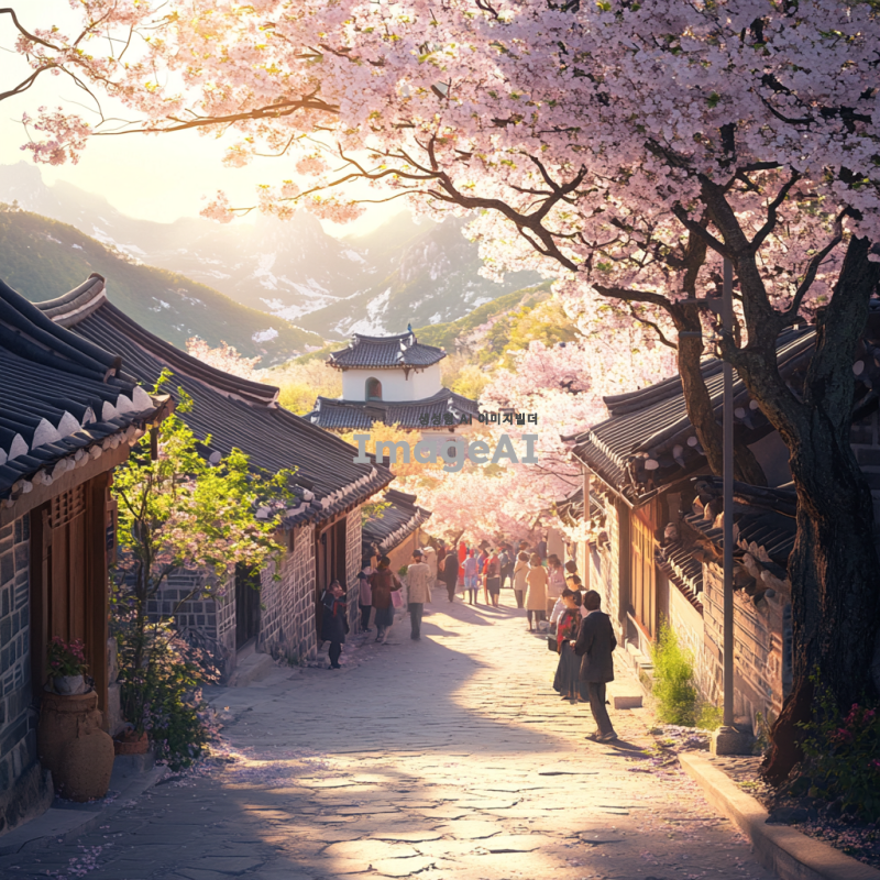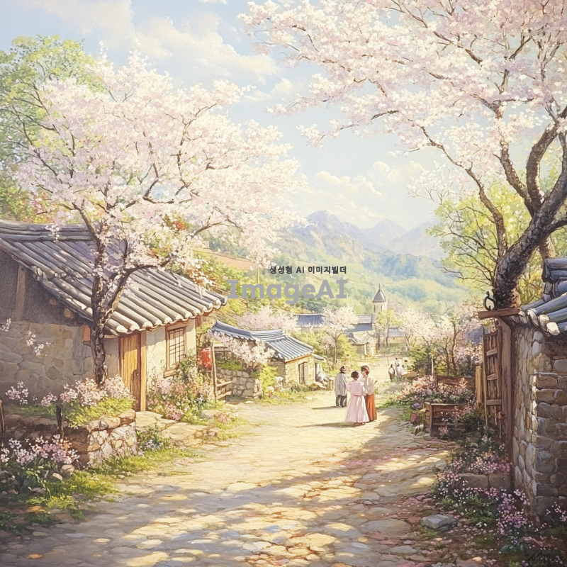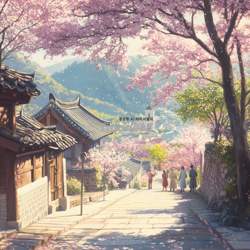 주님의 마음이 이곳에, 평화롭고 따뜻한 분위기의 한국 전통 마을 풍경, 햇살이 비치는 고즈넉한 골목길, 벚꽃이 만개한 나무들, 사람들은 서로 인사하며 웃고 있는 모습, 신앙의 상징으로 작은 성당이 배경에 보이는 장면, 부드러운 색감과 따뜻한 조명으로 아늑한 느낌을 주는 이미지.