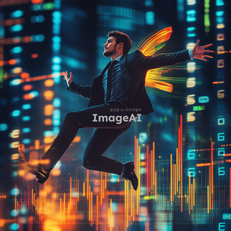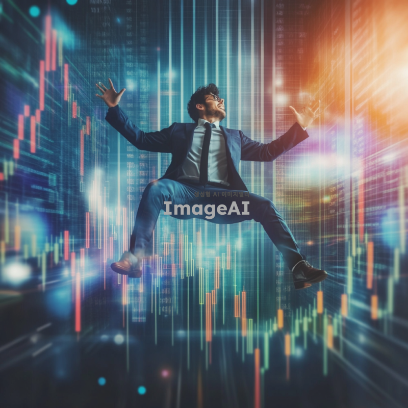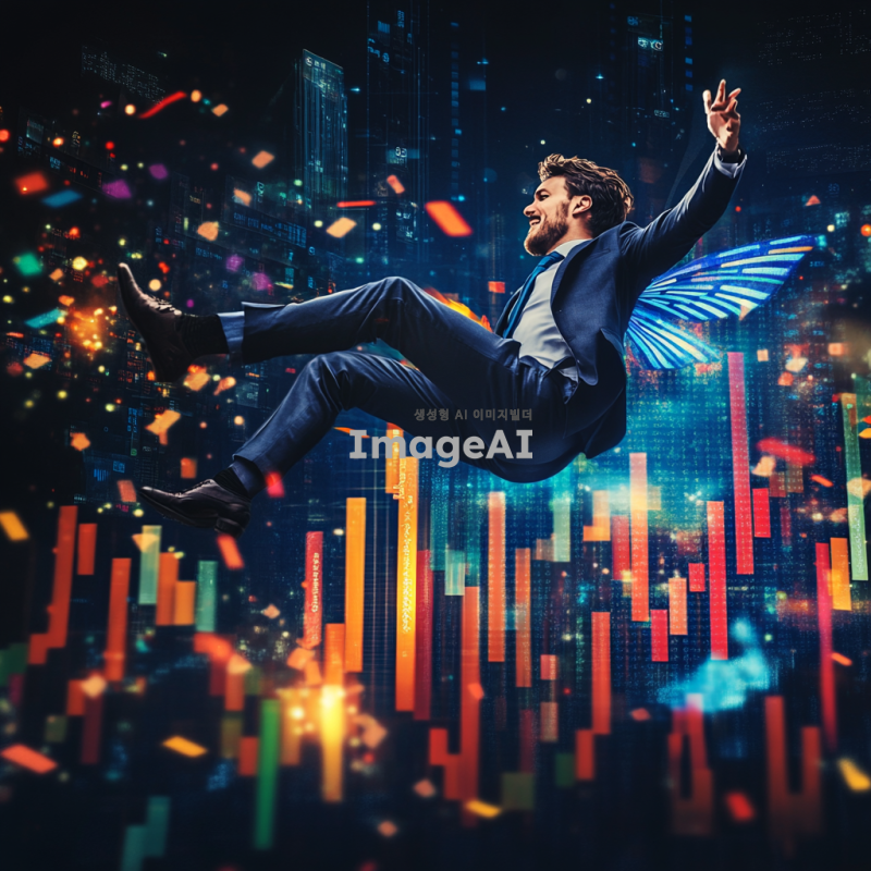 주식차트 위에서 불나방처럼 날아오르는 남성, 불장에 뛰어드는 모습, 차트의 상승세를 상징하는 화려한 색감과 역동적인 배경, 한국의 주식 시장을 배경으로 한 현대적인 분위기, 남성은 스마트한 비즈니스 복장을 하고 있으며 자신감 넘치는 표정으로 차트를 응시하고 있음.