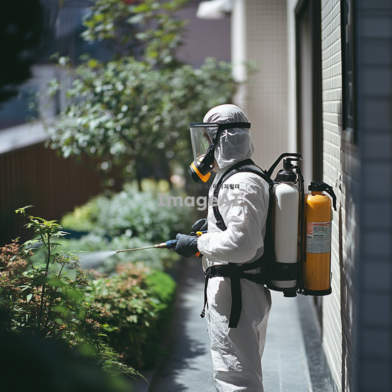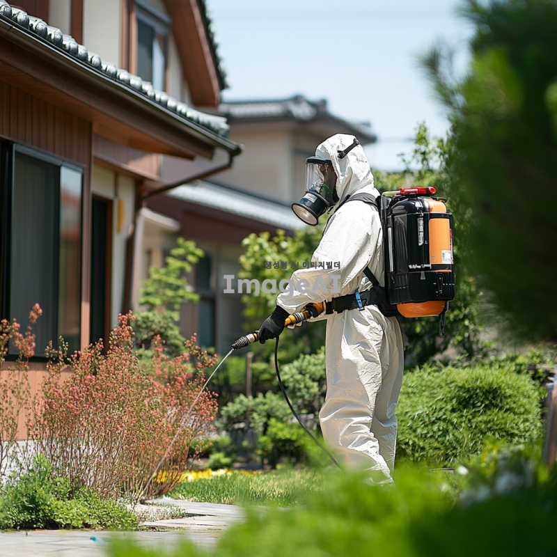 한국의 주택가에서 바퀴벌레, 개미, 모기를 잡기 위한 살충제 방역작업을 진행하는 모습. 전문 방역 직원이 방역 장비를 사용하여 주택 주변에서 작업하는 장면. 주택의 정원과 주변 환경이 잘 보이도록, 방역 약제가 분사되는 모습과 함께 방역 직원의 안전 장비가 강조됨. 맑은 날씨 속에서 방역 작업의 전문성과 신뢰성을 느낄 수 있는 이미지.