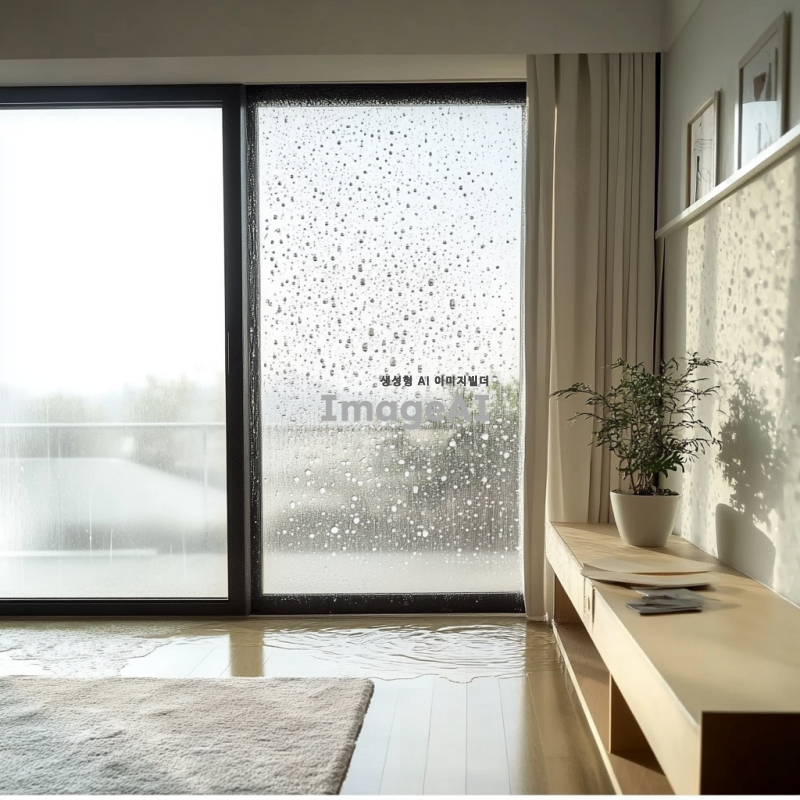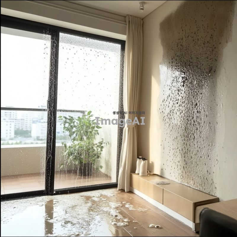 아파트의 결로 문제를 보여주는 실내 장면, 벽에 물방울이 맺힌 모습, 바닥에 물기가 고인 모습, 창문 주변에 결로가 심하게 발생한 상황, 자연광이 들어오는 밝은 분위기, 한국의 현대 아파트 인테리어 디자인, 문제의 심각성을 강조하는 디테일한 표현.