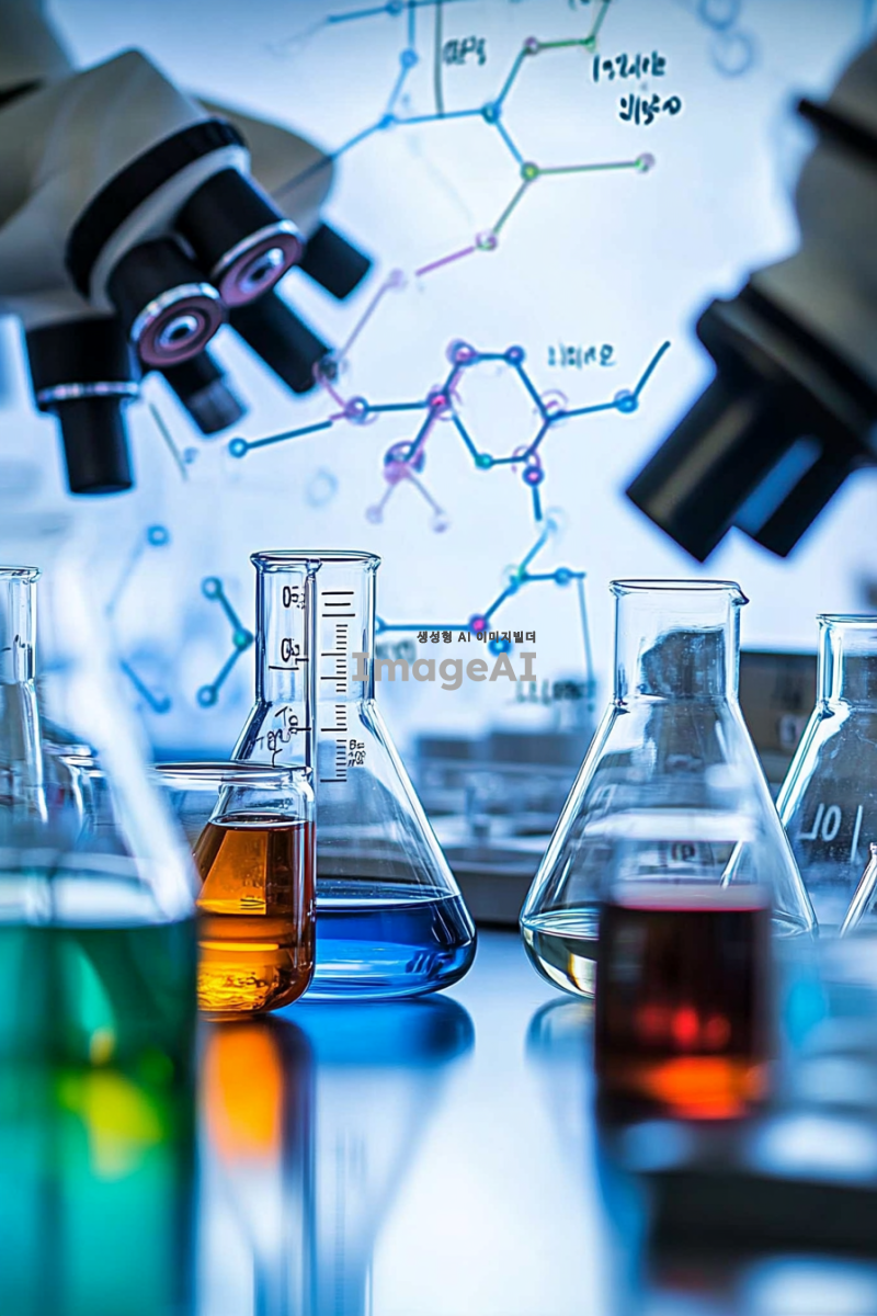 화학 실험실에서 다양한 화학 물질이 담긴 플라스크와 비커가 배열된 모습, 실험복을 입은 한국인 과학자가 흰색 장갑을 끼고 실험에 집중하는 장면, 배경에는 화학 공식과 구조식이 적힌 화이트보드가 보이며, 조명이 밝고 현대적인 느낌의 실험실 환경, 다양한 색상의 액체가 담긴 용기가 강조된 이미지.