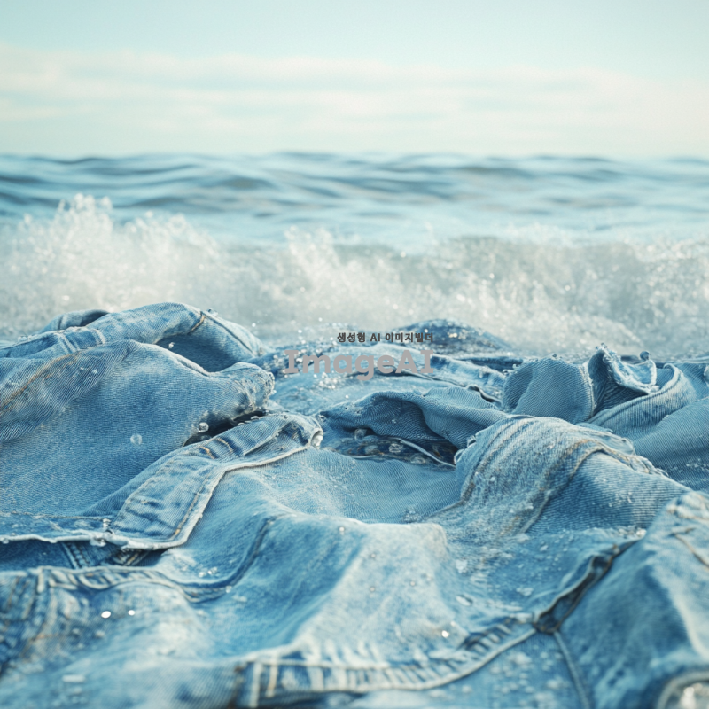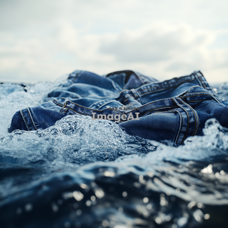 물에 셀비지데님을 담근 사진을 만들어줘. 셀비지데님의 물이 빠져서 물 색이 파란색이였음 좋겠어.