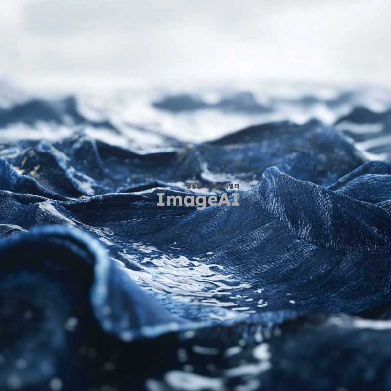 물에 셀비지 데님을 담근 모습, 물속에서 셀비지 데님이 물에 젖어 색이 빠져 파란색으로 변한 장면, 자연광이 비치는 분위기, 물결이 일렁이는 모습, 배경은 흐릿하게 처리하여 데님에 집중할 수 있도록.