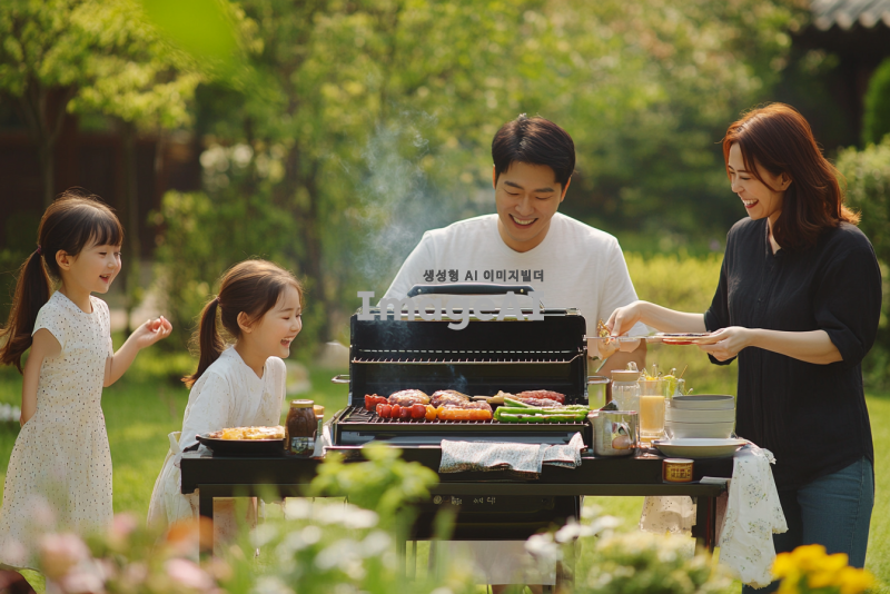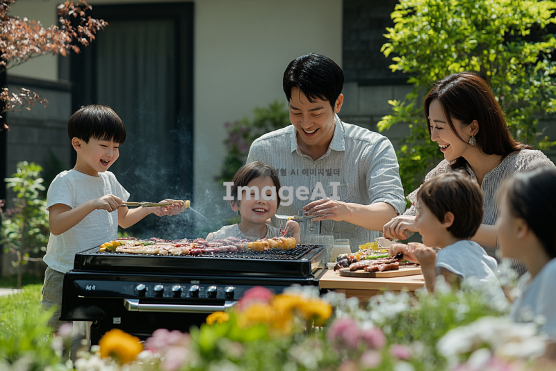 정원에서 한국의 오뚜기 제품을 사용하며 즐거운 시간을 보내고 있는 화목한 가족의 모습. 가족 구성원은 모두 한국인으로, 아버지와 어머니는 바비큐를 굽고 있고, 아이들은 주변에서 놀고 있는 장면. 화창한 날씨 속에서 푸른 잔디와 꽃들로 가득한 정원, 오뚜기 제품이 테이블 위에 놓여 있는 모습. 가족의 웃음과 따뜻한 분위기가 느껴지는 장면.