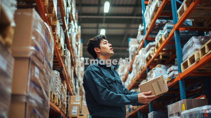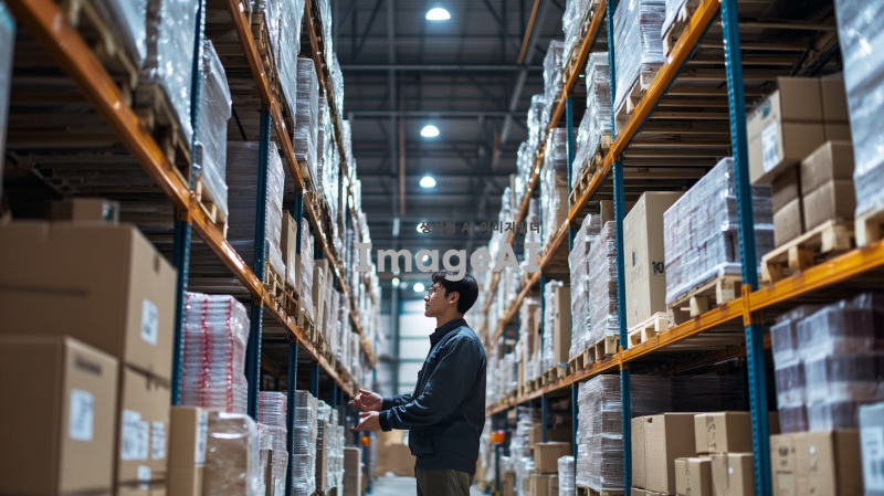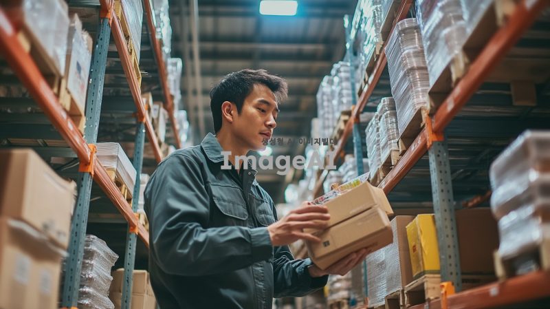 물류창고 내부, 한국인 남성이 상품을 검수하고 있는 모습. 주변에는 다양한 박스와 물품들이 정리되어 있으며, 밝은 조명 아래에서 일하는 분위기. 남성은 작업복을 입고 있으며, 집중한 표정으로 상품을 체크하고 있는 장면. 물류창고의 선반과 물품들이 잘 보이도록 구성.