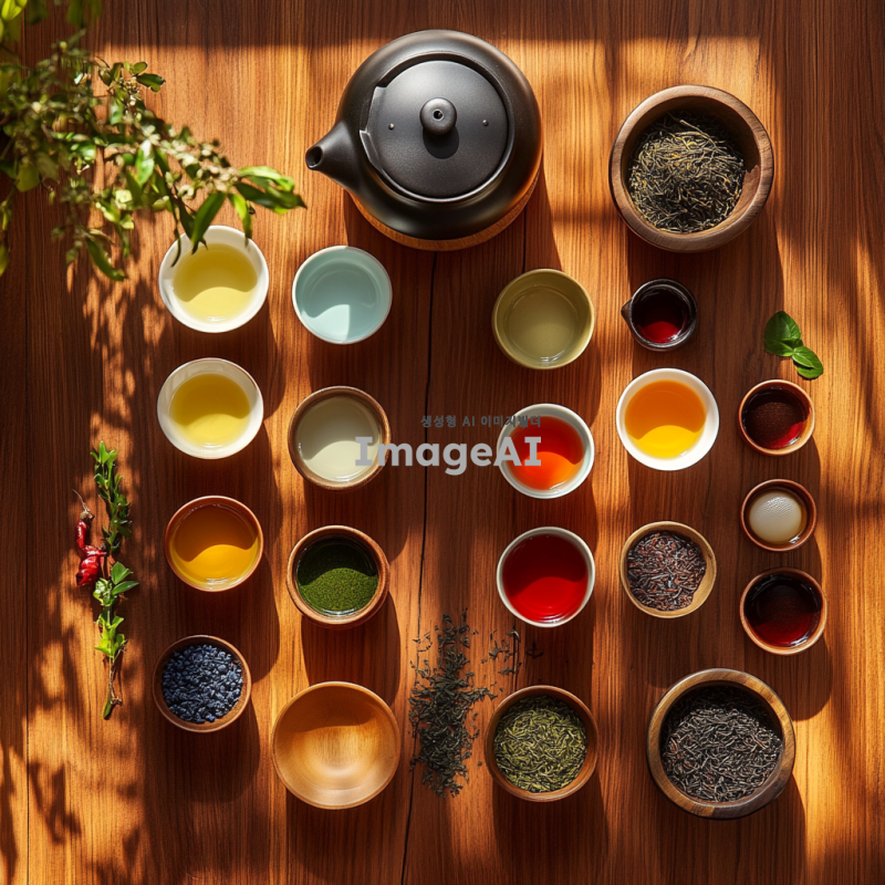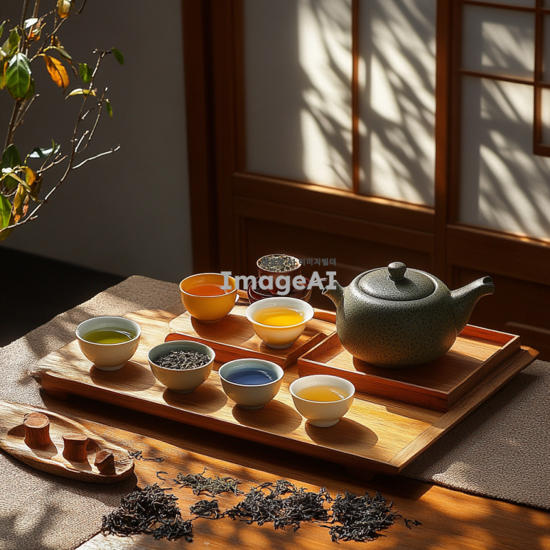 자사호에 담긴 다양한 종류의 차를 세팅한 이미지. 녹차, 백차, 청차, 황차, 흑차, 홍차를 각각 아름답게 담아낸 자사호와 차잔, 차주전자, 차도구들을 배치. 자연광이 비치는 아늑한 차실에서 차의 색감과 질감을 강조하며, 전통적인 한국의 차 문화를 반영한 요소들이 포함된 장면. 차 잎과 찻잔 주변에 차와 관련된 소품들이 자연스럽게 각각 배치되어 있는 모습.
