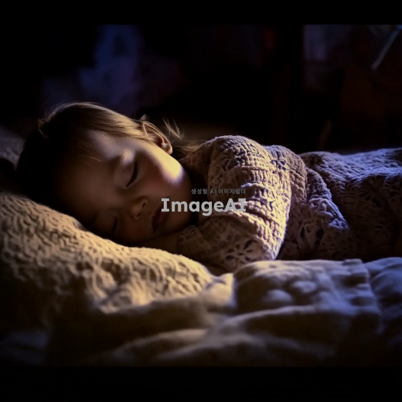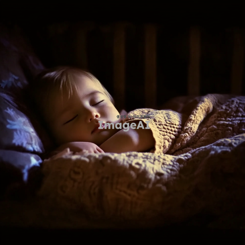 어두운 방 안에서 편안하게 잠든 동양 아기, 평화로운 꿈을 꾼다. 잠든 아기는 옆으로 누워서 이불을 감싸고 있다.