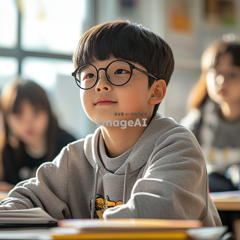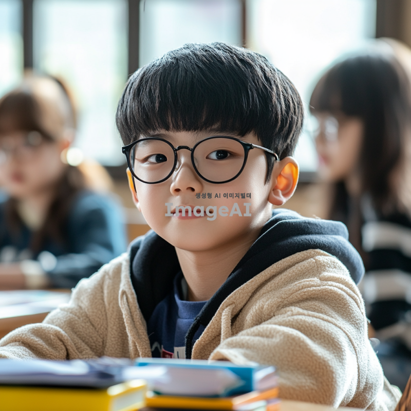 검은색 안경을 쓰고 바가지머리를 한 한국의 6학년 남학생. 밝은 표정으로 교실에 앉아 있으며, 책상 위에는 학용품과 교과서가 놓여 있다. 주변에는 친구들이 함께 공부하는 모습이 보인다. 자연광이 들어오는 창가 근처에서 공부하는 모습.
