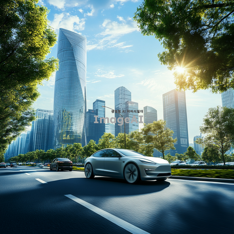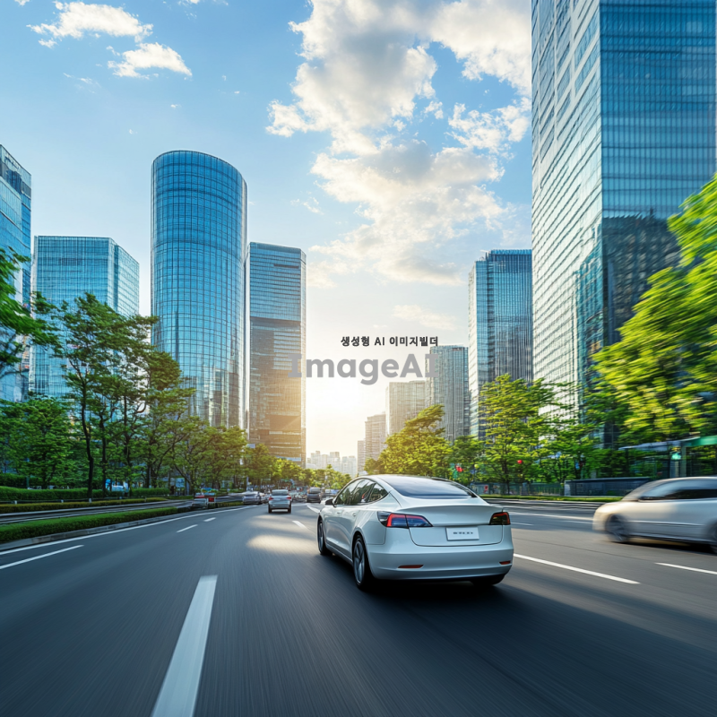 한국의 현대적인 도시 배경 속에서 세련된 디자인의 전기차가 도로를 달리고 있는 모습, 푸른 하늘과 구름이 어우러진 풍경, 주변에는 고층 빌딩과 나무들이 조화를 이루고 있는 장면. 차체의 반사광이 빛나는 모습과 함께, 도로 위의 차량들이 부드럽게 움직이는 역동적인 분위기.