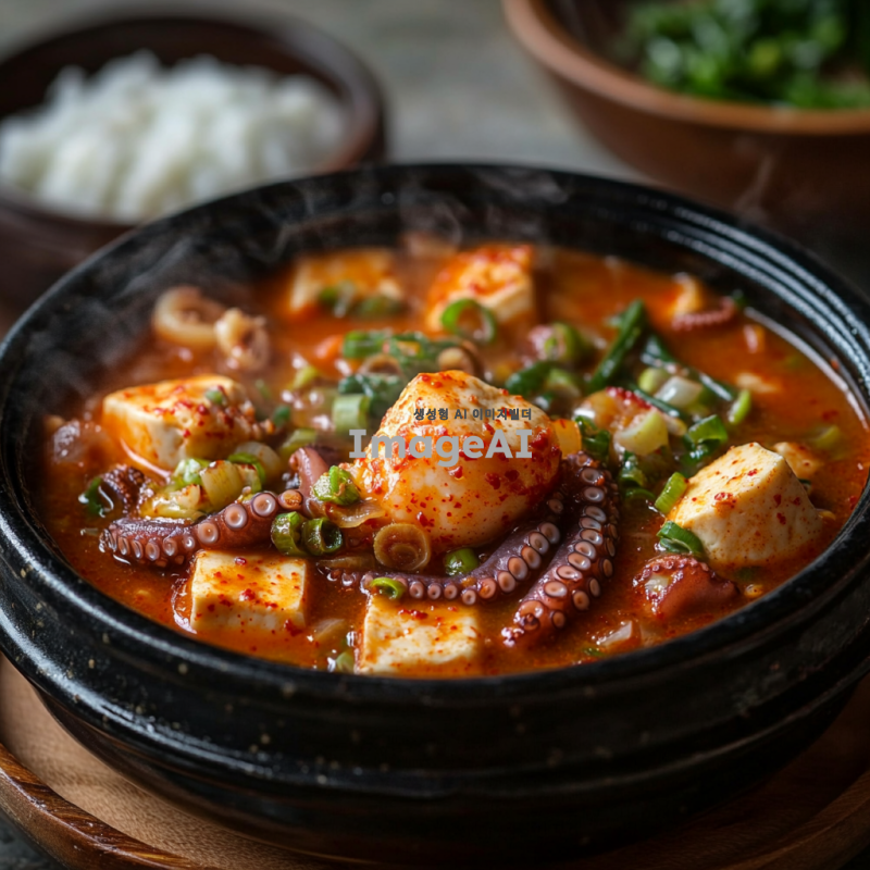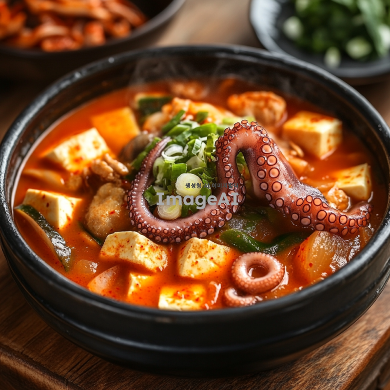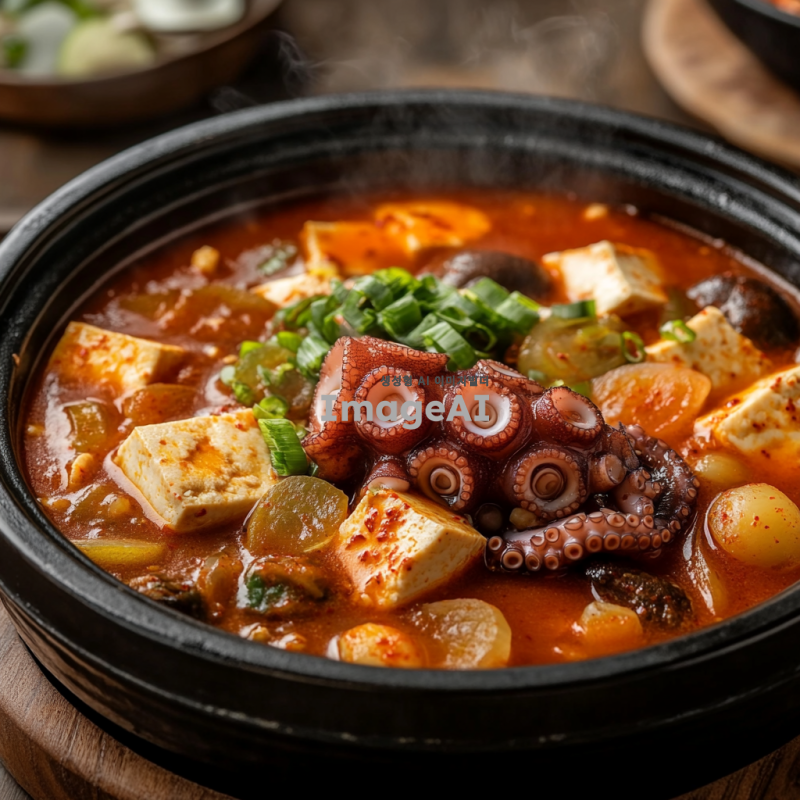 얼큰해장순두부찌개, 문어다리 1개가 중앙에 위치하여 강조된 모습, 고화질, 따뜻한 색감, 맛있어 보이는 재료들, 김이 모락모락 나는 찌개, 한국 전통 식기에서 제공되는 모습, 식욕을 자극하는 디테일