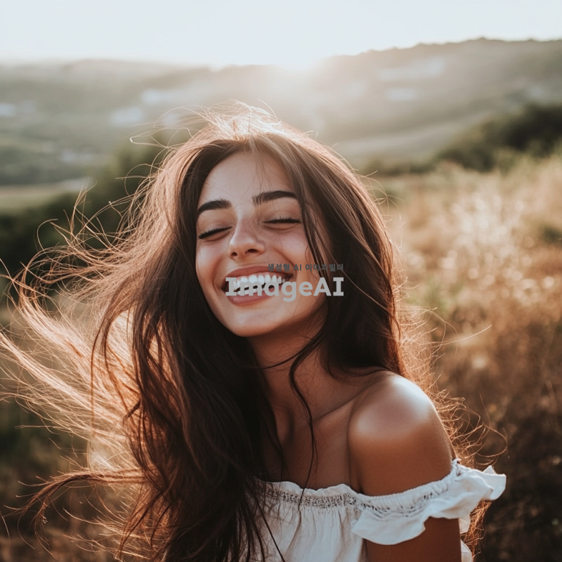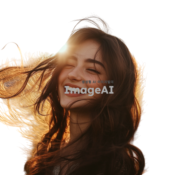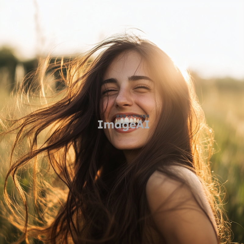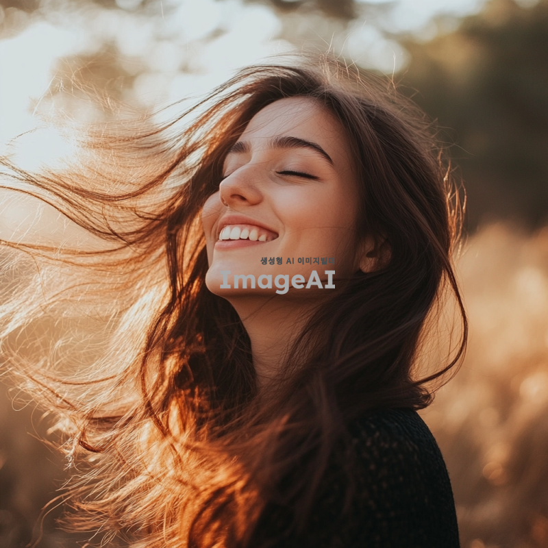 긴 갈색 톤의 생머리가 바람에 휘날리는 여성의 모습, 자연 풍경 속에서 자유롭게 웃고 있는 모습, 부드러운 햇살이 그녀의 머리카락을 비추며 따뜻한 느낌을 주는 장면, 편안하고 행복한 분위기, 여성의 표정은 생기 넘치고 자신감이 넘치는 모습.