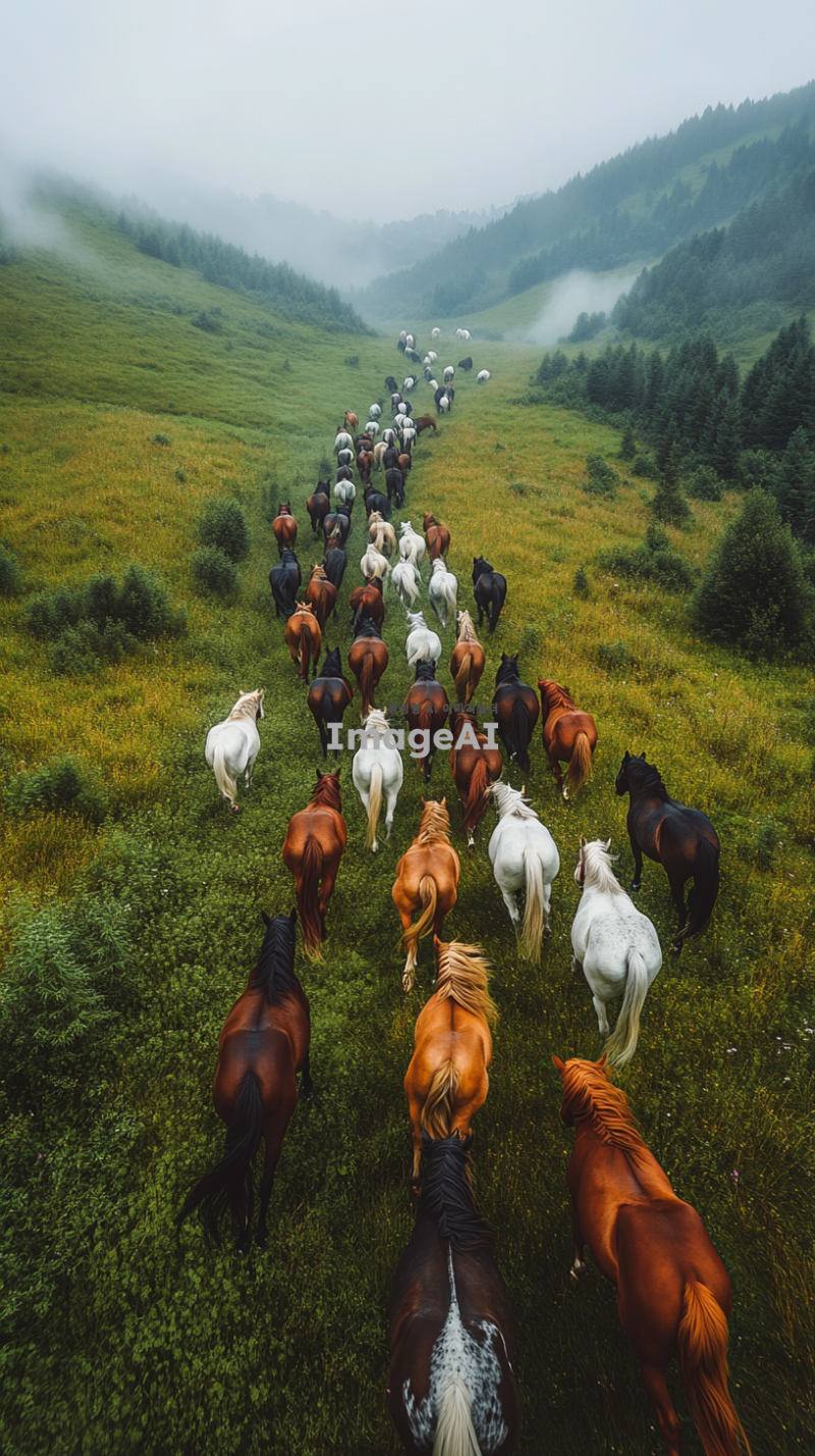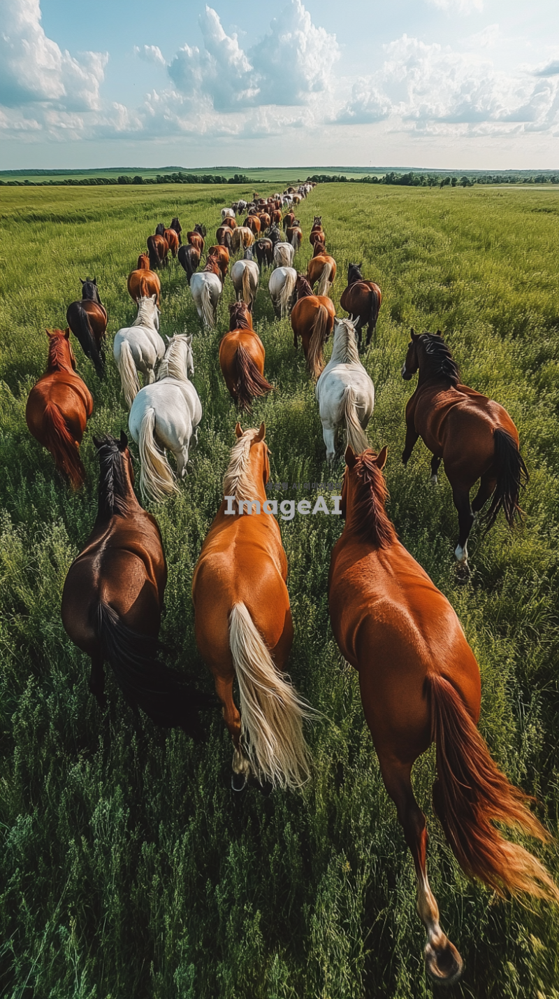 푸른 초원 위에서 다양한 색의 말들이 달리고 있는 모습을 하늘에서 바라본 장면. 초원의 푸른색과 말들의 다채로운 색상이 조화를 이루며, 넓은 하늘과 구름이 배경을 이루는 풍경. 자연의 아름다움과 자유로운 느낌이 잘 드러나는 이미지.