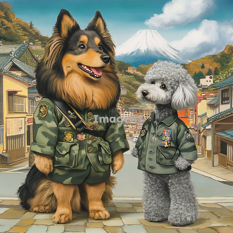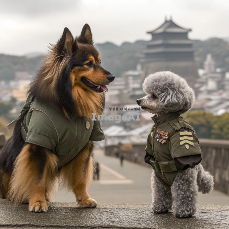 헉교를 배경으로 한 군견옷을 입고 있는 황토색과 검은색이 섞인 큰 셸티 강아지 한 마리와 군견옷을 입고 있는 작은 회색 실버푸들 한 마리가 함께 있는 장면. 배경은 헉교의 특징적인 건물과 자연경관이 어우러져 있고, 강아지들은 서로를 바라보며 친근하게 서 있다.