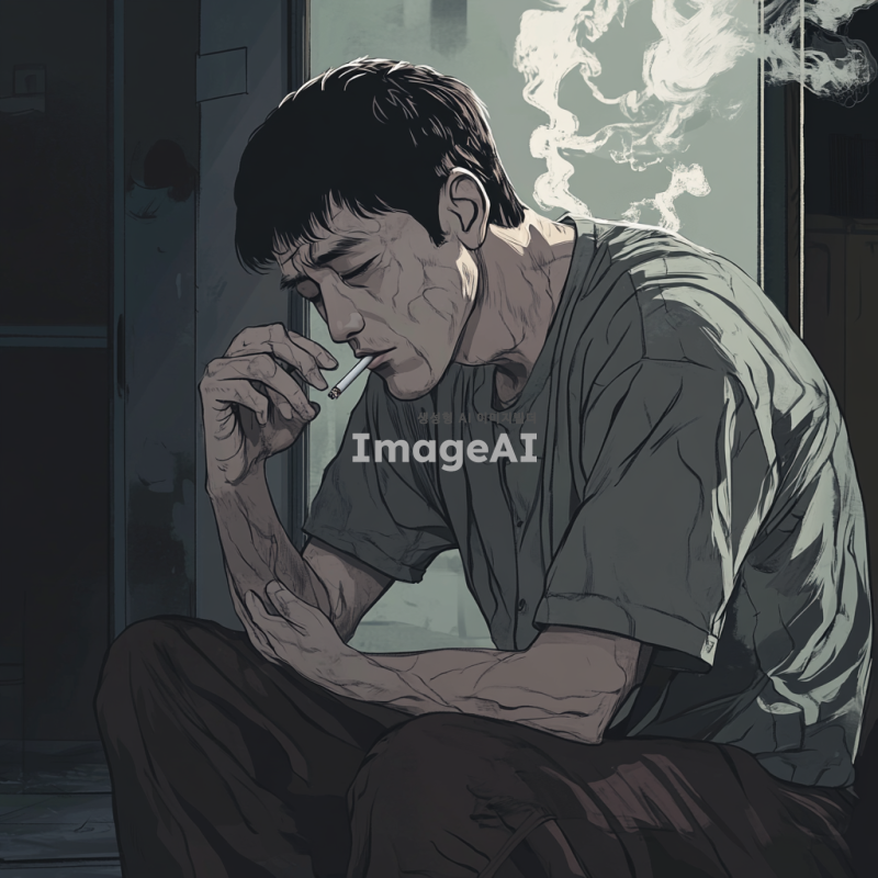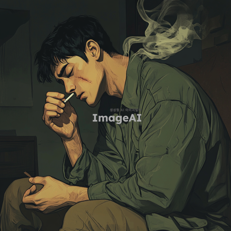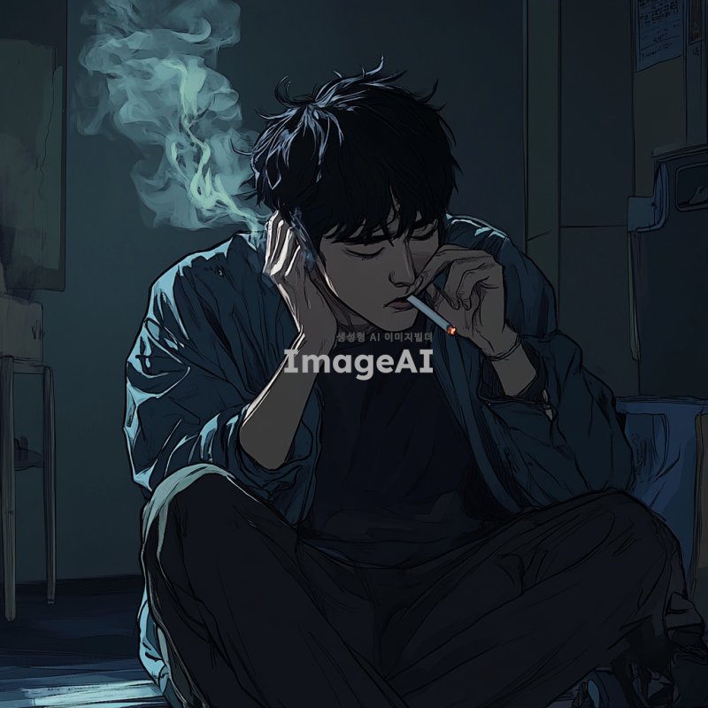 쭈구려 앉아 담배를 피우고 있는 한국 남성, 약간 잘생긴 외모, 간단한 카툰 스타일, 배경은 어주컴컴한 방, 캐주얼한 복장, 절망적이고 졸리고 피곤한 표정, 담배 연기가 퍼져나가는 모습.