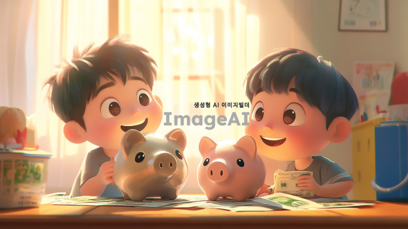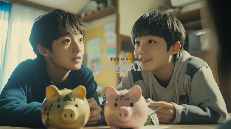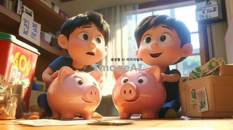 형과 동생이 각자의 방에 앉아 저금통을 앞에 두고 대화하는 장면. 형은 8000원, 동생은 2000원이 들어 있는 저금통을 바라보며 자신감 넘치는 표정으로 말하고 있다. 동생은 도전적인 표정으로 형을 바라보며 매일 500원씩 저금할 것이라고 결심한 모습. 방 안은 아늑하고 따뜻한 느낌으로, 저금통은 각각 다르게 디자인되어 있으며, 형의 저금통은 크고 화려한 반면 동생의 저금통은 작고 귀여운 디자인이다. 다음 날 아침, 형과 동생이 저금통에 돈을 넣는 장면. 두 사람은 서로를 바라보며 웃고 있고, 저금통에는 각각의 돈이 들어가고 있는 모습이 보인다. 방 안은 밝고 상쾌한 아침 햇살이 들어오며, 두 사람의 우정이 느껴지는 따뜻한 분위기로 표현된다.